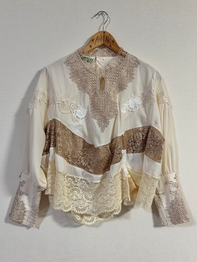 レースフラワーブラウス 柔らかなアイボリーを基調に、ベージュや生成りのアンティークレースを丁寧にコラージュした、クラシカルで上品なブラウス。 首元のレースデザインが顔まわりを華やかに見せ、さりげない透け感が女性らしさを引き立てます✨ 甘くなりすぎないよう、異素材をバランスよく配置し、日常にも特別な日にも寄り添う一着に仕上げました。 デニムでカジュアルダウンしても、スカートと合わせてドレスアップしても☺️ 時間を重ねたレースたちが、新しい物語を纏う服です❤️ ※こちらは状態の良い古着をリメイクしております。状態の良い商材を使用しておりますが、使用感のある場合もございますので予めご了承くださいませ。古着に抵抗がある方は申し訳ございませんがご購入をご遠慮ください。 These items are remade from old clothes in good condition. Although we use materials in good condition, please note that there may be some signs of use. If you are not comfortable with old clothes, please refrain from purchasing this item. ASKLAR REBIRTH(アスクラーリバース)とは、古着や売れ残ったお洋服をASKLARらしくリメイクし、処分される予定だったお洋服たちを新しく生まれ変わられるプロジェクトです。 地球にも優しくありながら、ファッションを楽しんでいただけますと幸いです。 ASKLAR REBIRTH is a project to remake old and unsold clothes in the style of ASKLAR, and to rebirth clothes that were to be disposed of. We hope you will enjoy fashion while being kind to the earth. ○素材・material○ 本体 リメイク品のため素材不明 ○サイズ・size◯ ・着丈(body length)= 前約51cm、後ろ約63cm ・肩幅(shoulder width)= 約41cm ・身幅(body width)=約 68cm ・袖丈(sleeve length)=約 59cm ※水に濡れた状態で擦ると色移りする可能性がありますので、ご注意ください。 ※記載していますお写真と実物の色味に違いが出る場合や、記載しているサイズと数センチ違う場合などがございますので、予めご了承くださいませ。 ※水に濡れた状態のままでいると色移りしたり、色落ちする可能性がございますので、その場合は乾いた柔らかい布で水気を拭き取り、風通しの良い日陰で乾かしてください。 ※タンブラー乾燥はご遠慮ください。 ※部位によっては素材が熱により変形してしまう素材がございますので、アイロン掛けはご遠慮ください。 This product is a colored product. Please be careful not to rub the product when it is wet with water, as this may cause color migration. Please understand in advance that there may be a difference in the color of the actual product from the picture shown, or that the size may differ by several centimeters from the size shown. In that case, please wipe off the moisture with a soft dry cloth and dry in the shade with good ventilation. Please refrain from tumbler drying. Please refrain from ironing as some materials may be deformed by heat depending on the part.