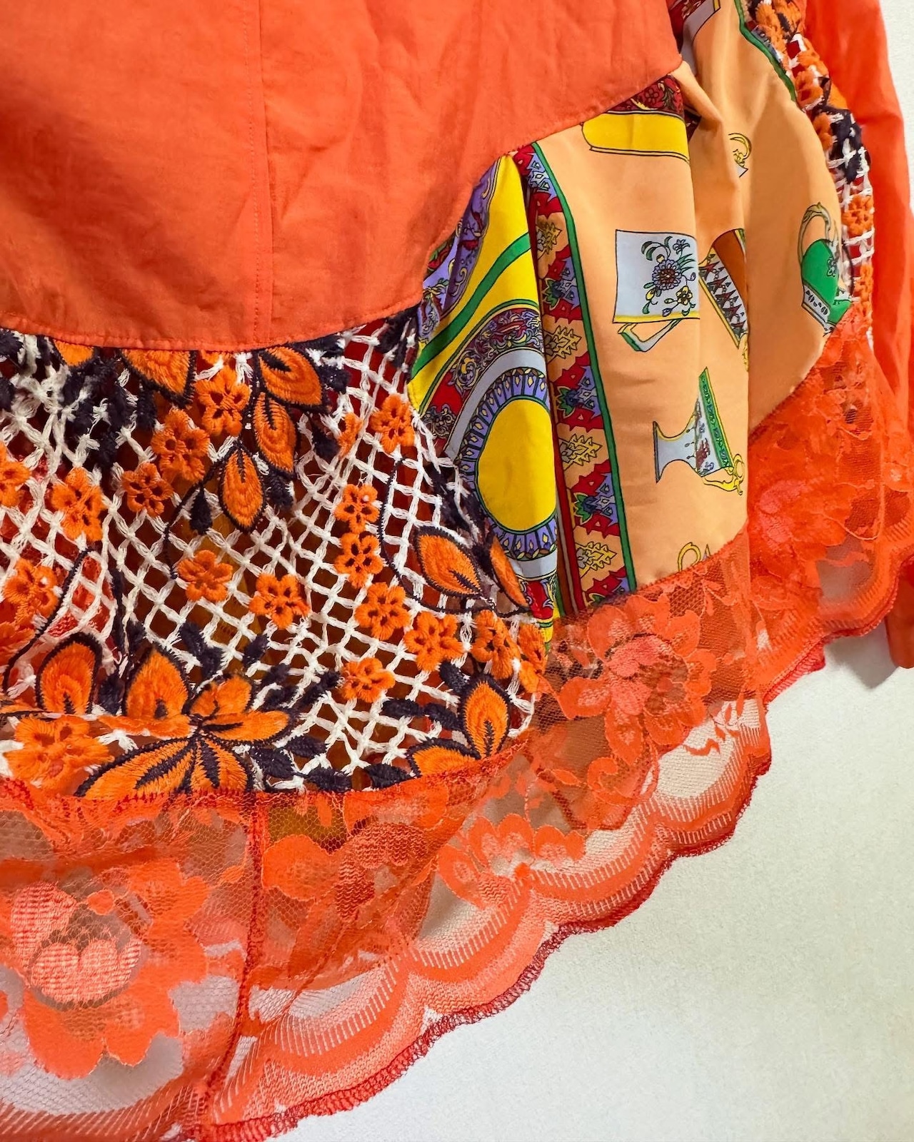 鮮やかなオレンジをベースに、レースやアフリカンプリントなど異素材をミックス。
