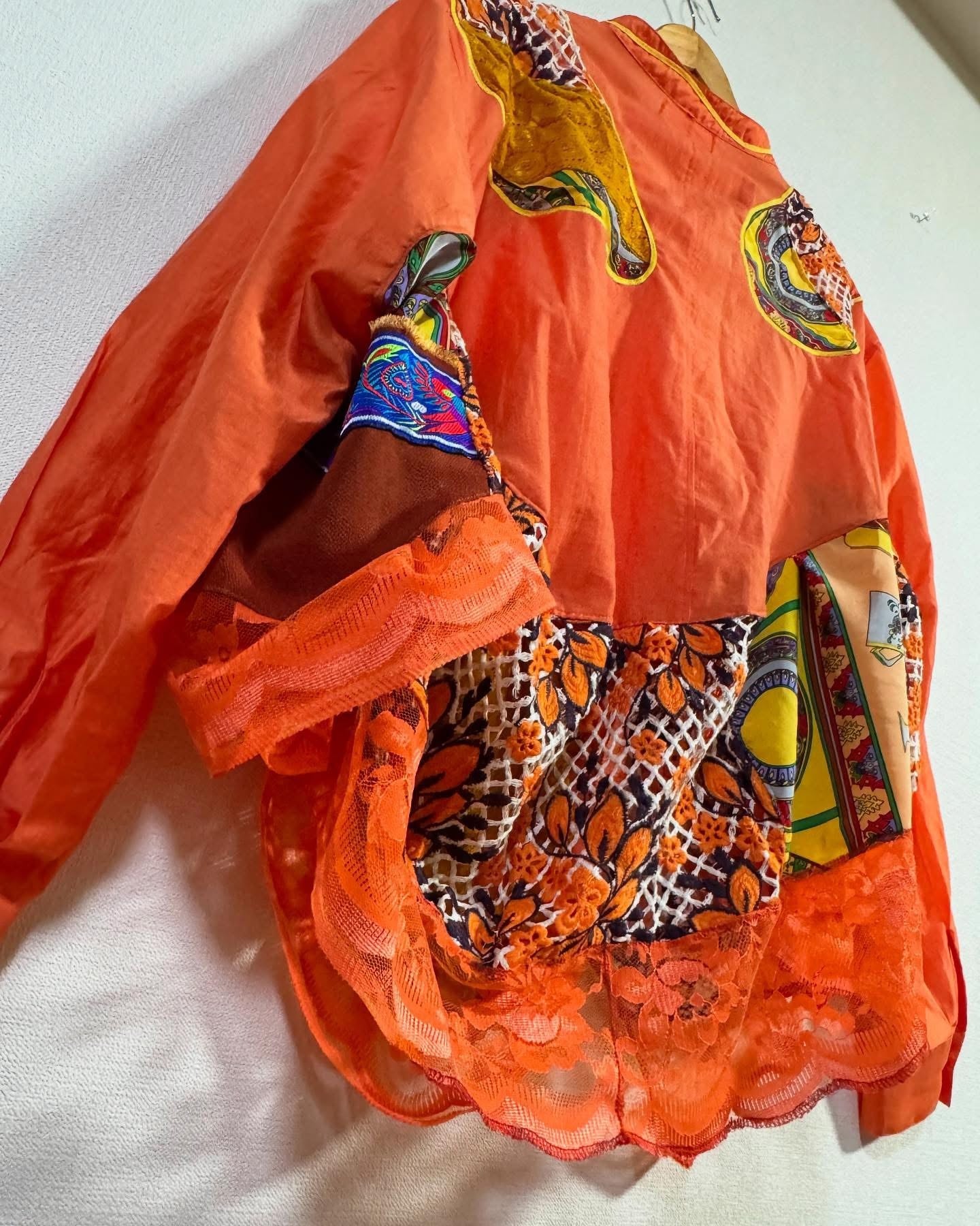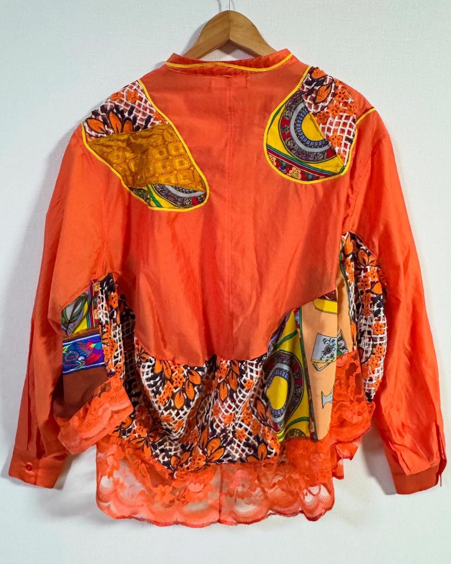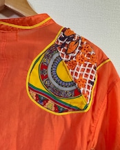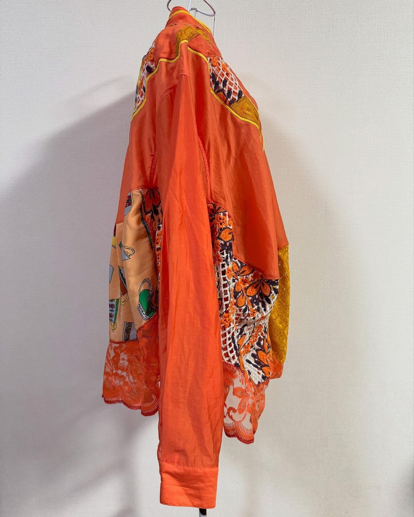ビタミンカラーのオレンジをベースに、古着の素材を組み合わせ、再構築した一点もののリメイクシャツ。