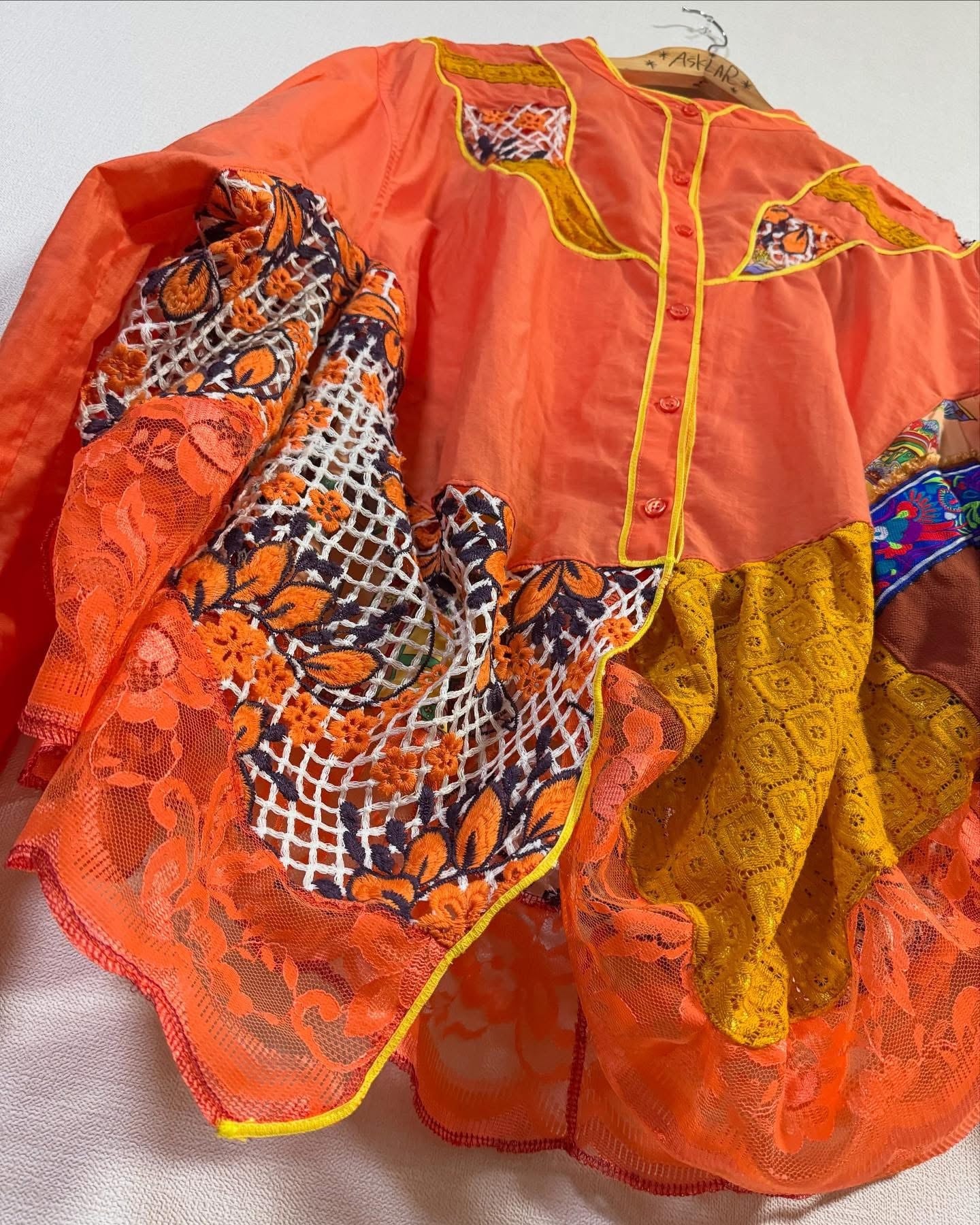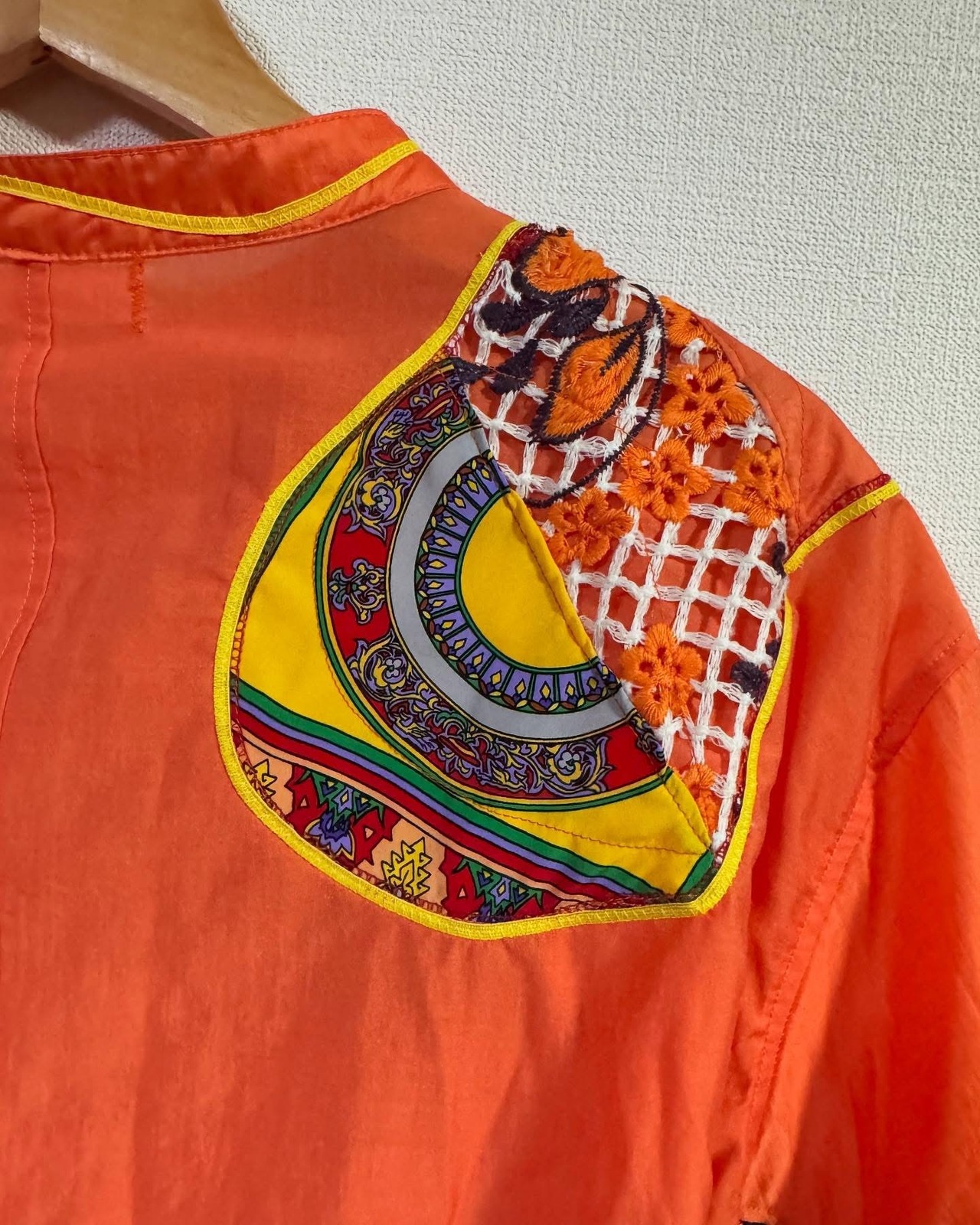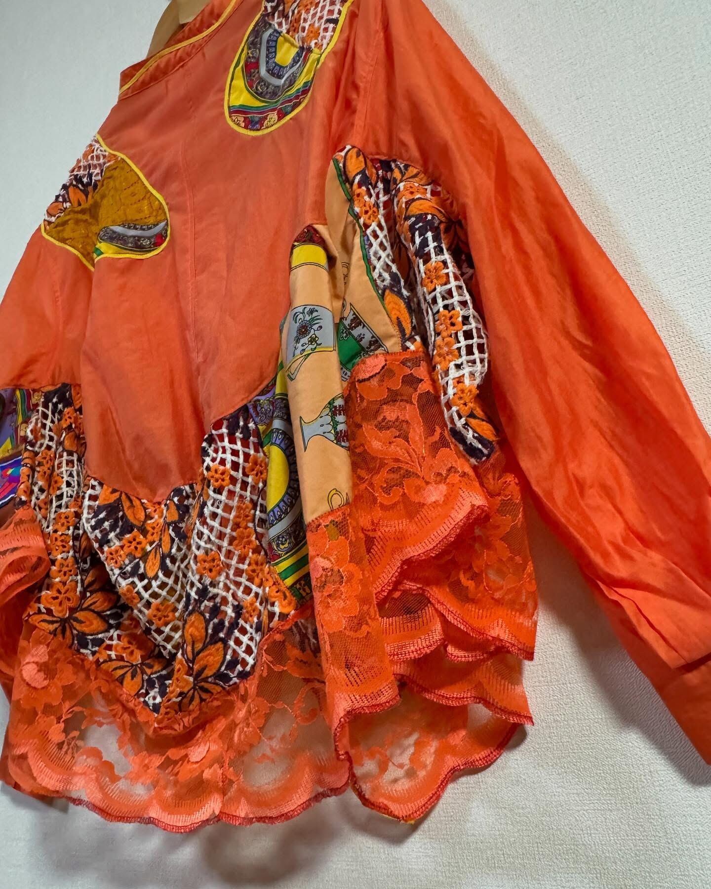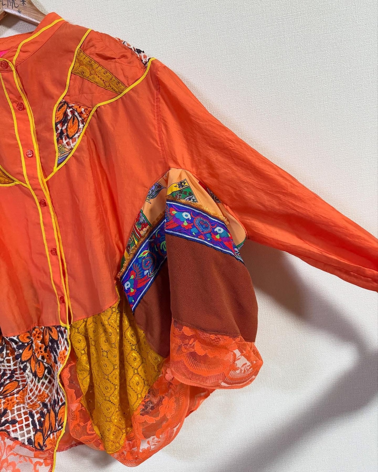 ビタミンカラーのオレンジをベースに、古着の素材を組み合わせ、再構築した一点もののリメイクシャツ。