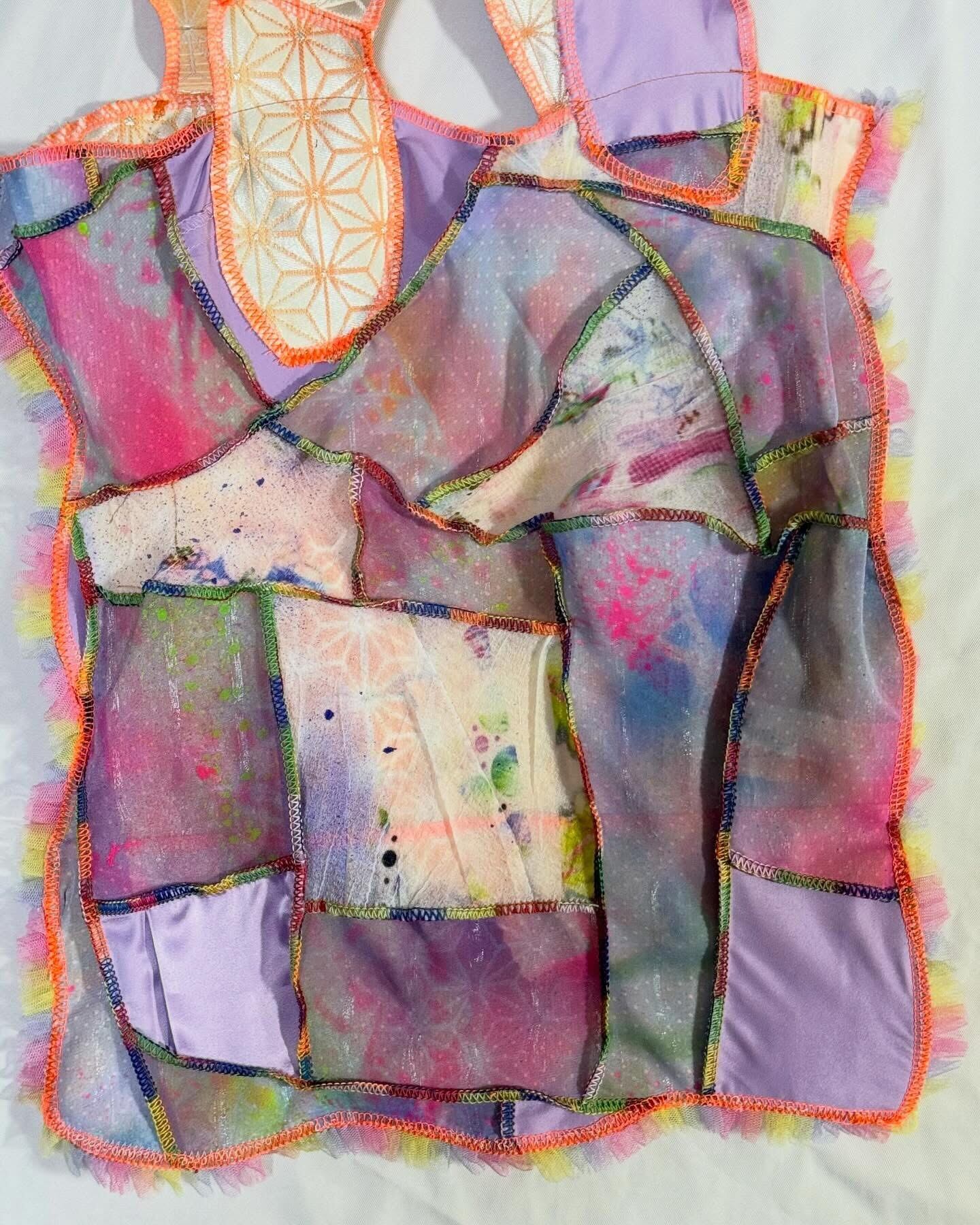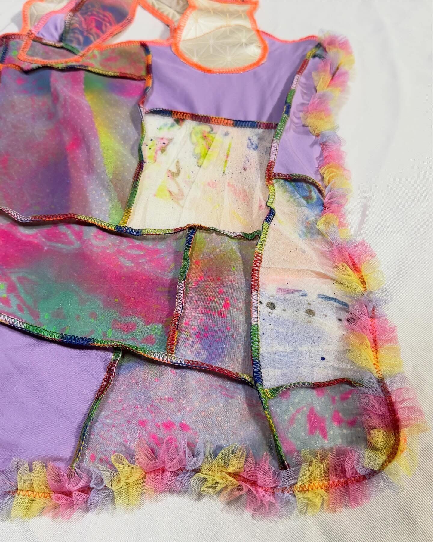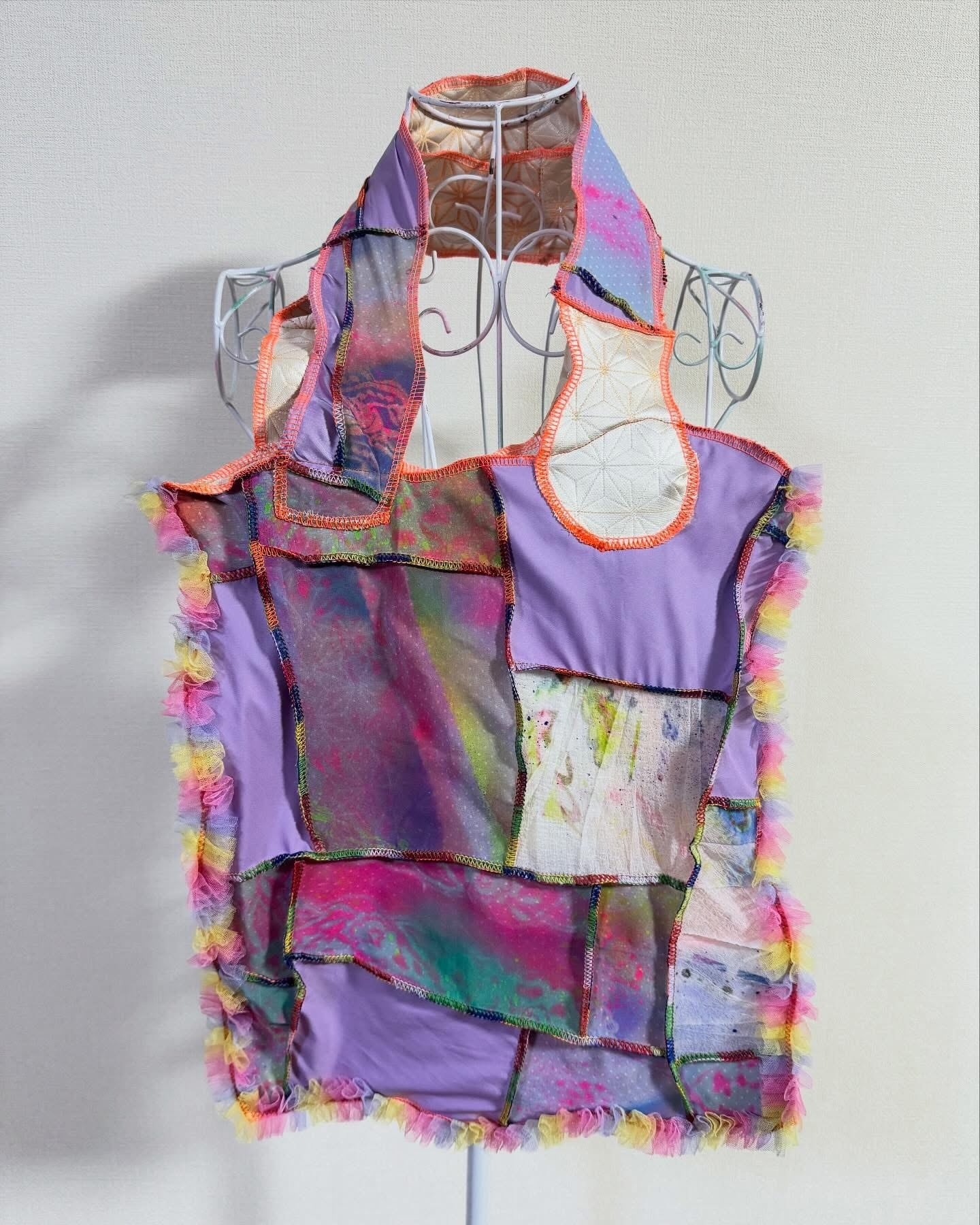 透け感のあるチュールやカラフルな布片をつなぎ合わせ、夢の断片を縫い集めたようなデザイン。