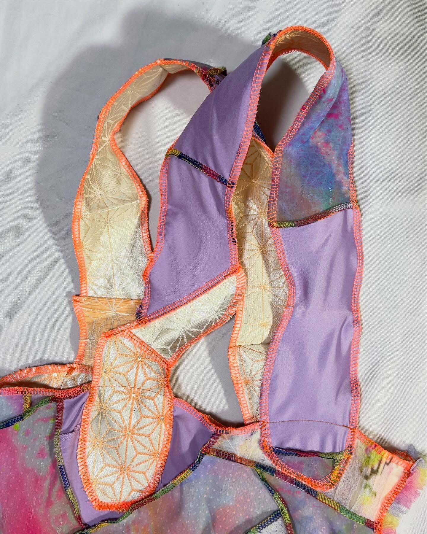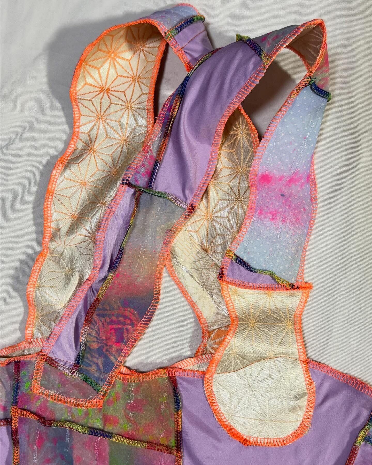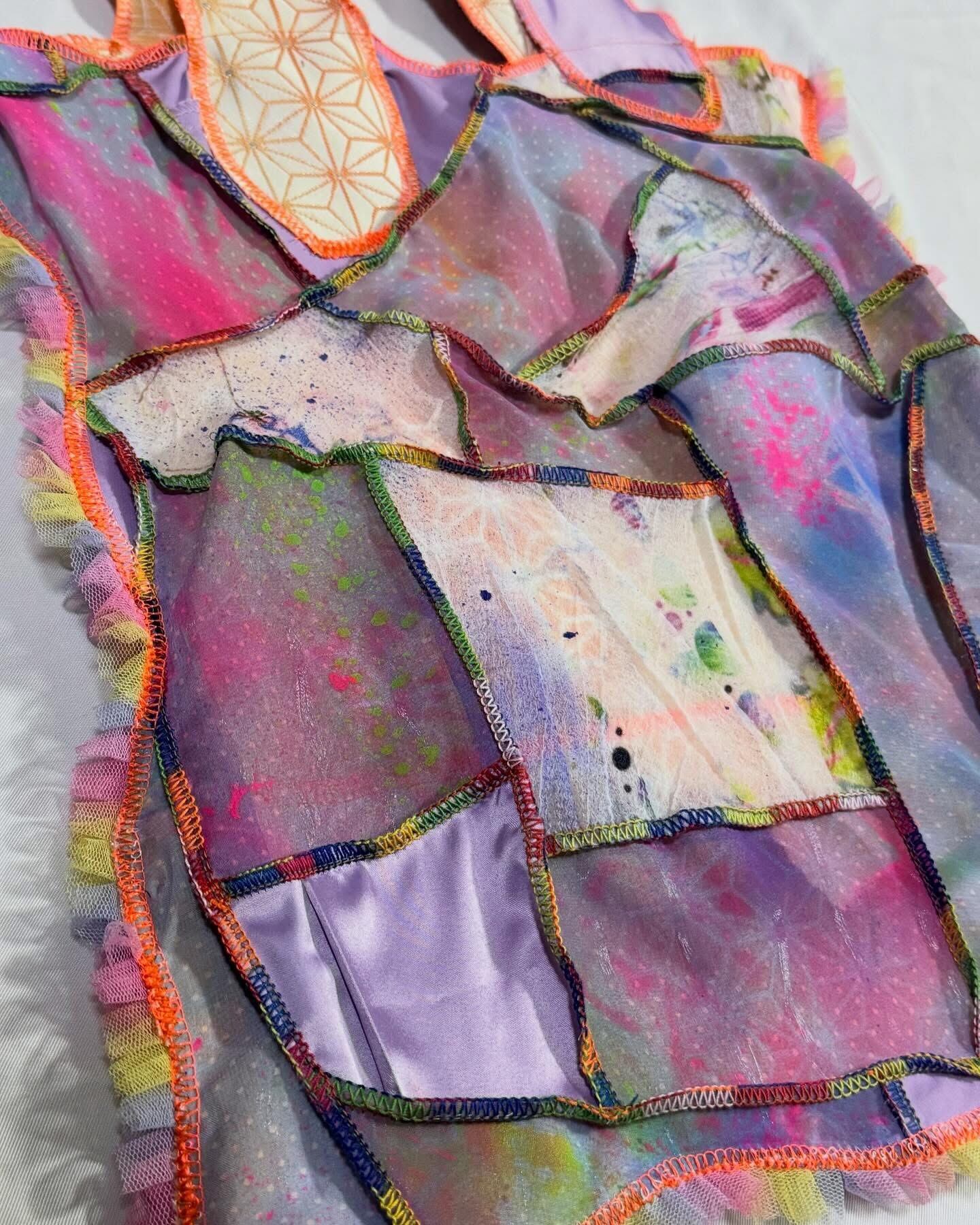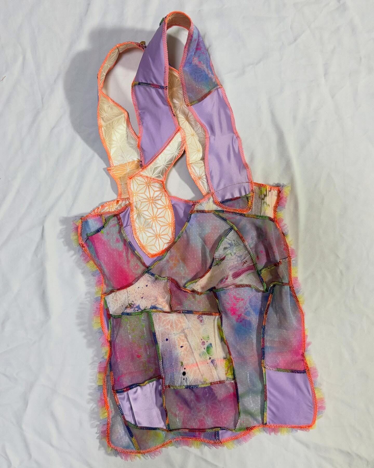 透け感のあるチュールやカラフルな布片をつなぎ合わせ、夢の断片を縫い集めたようなデザイン。