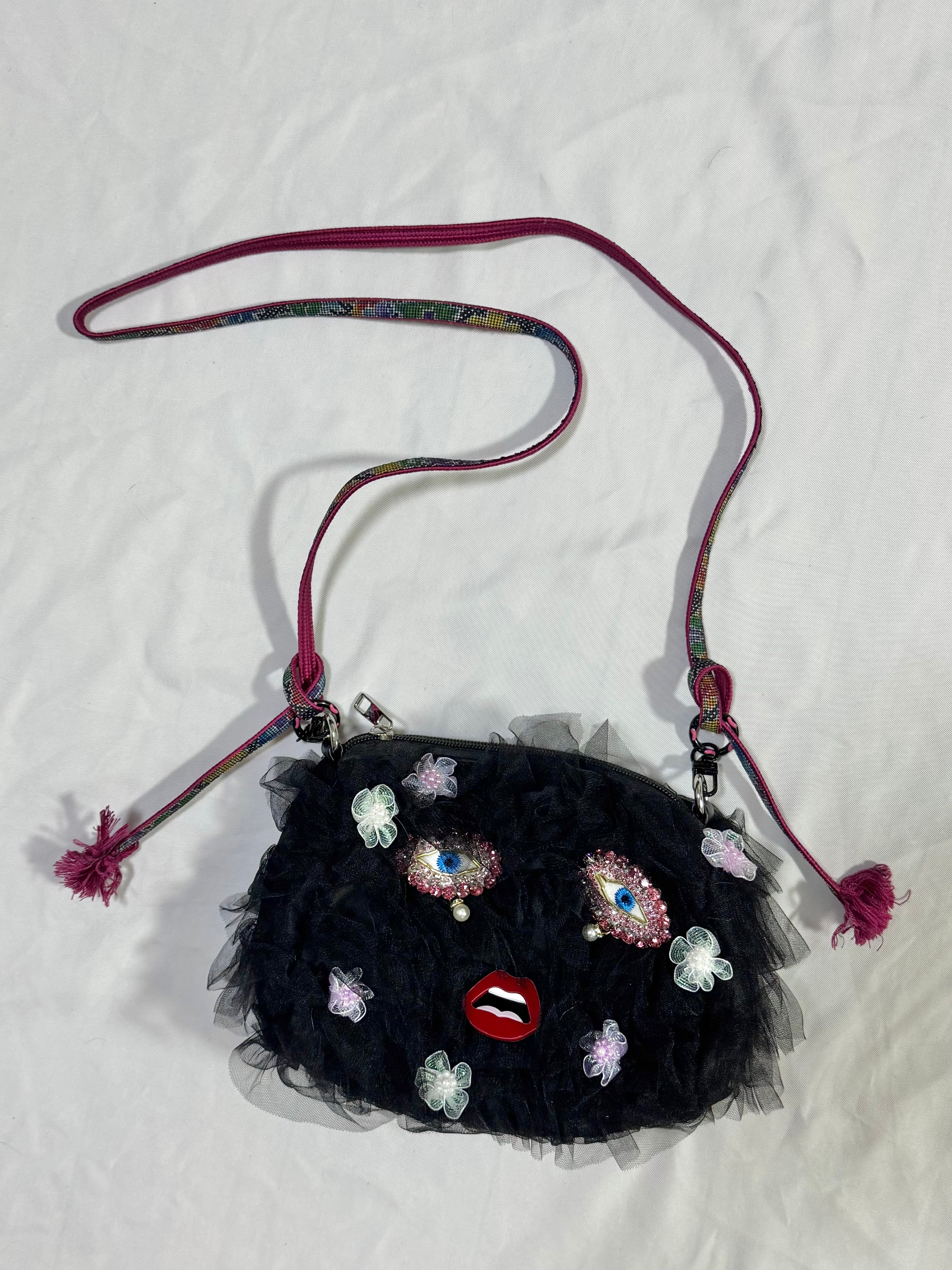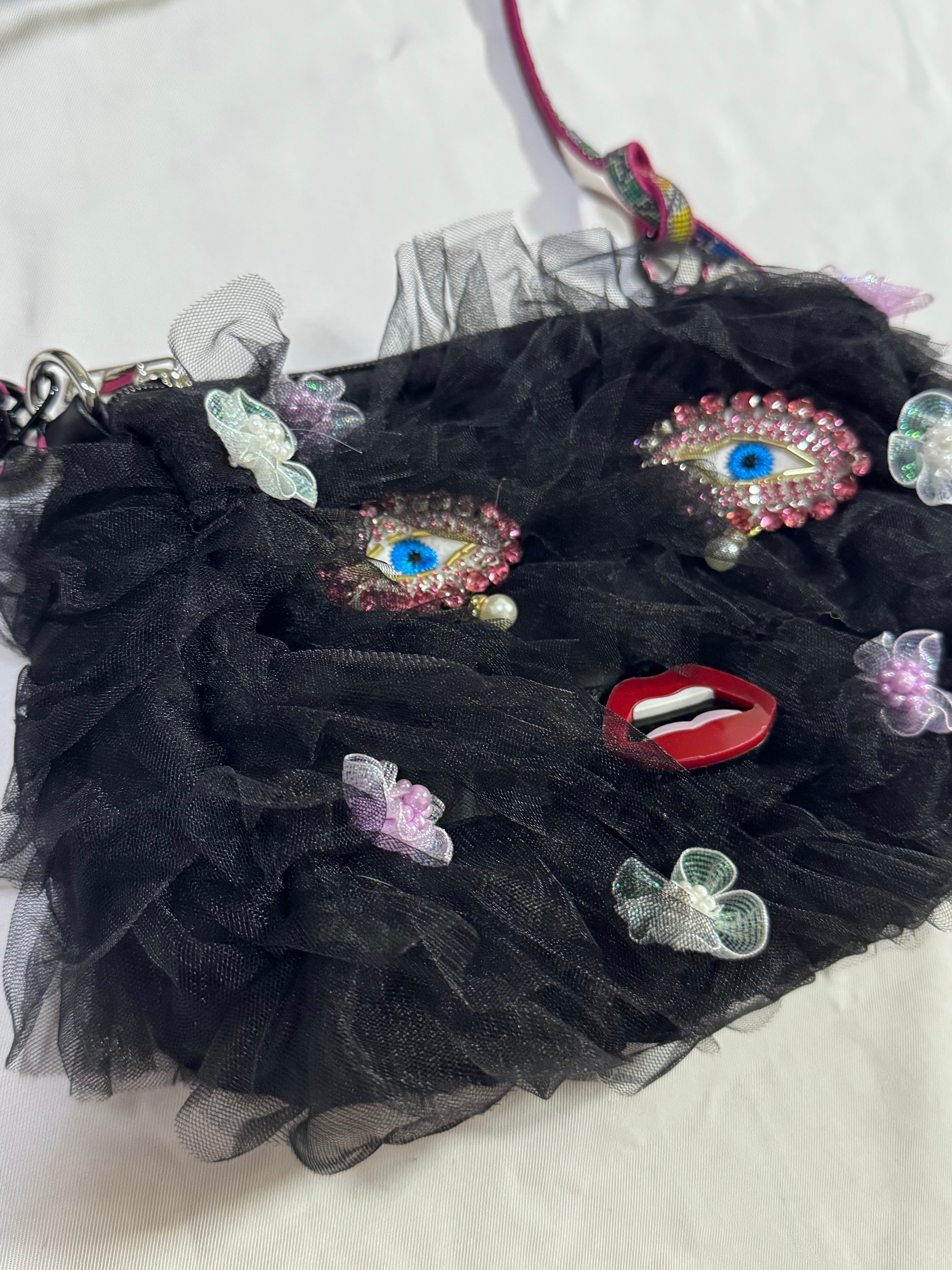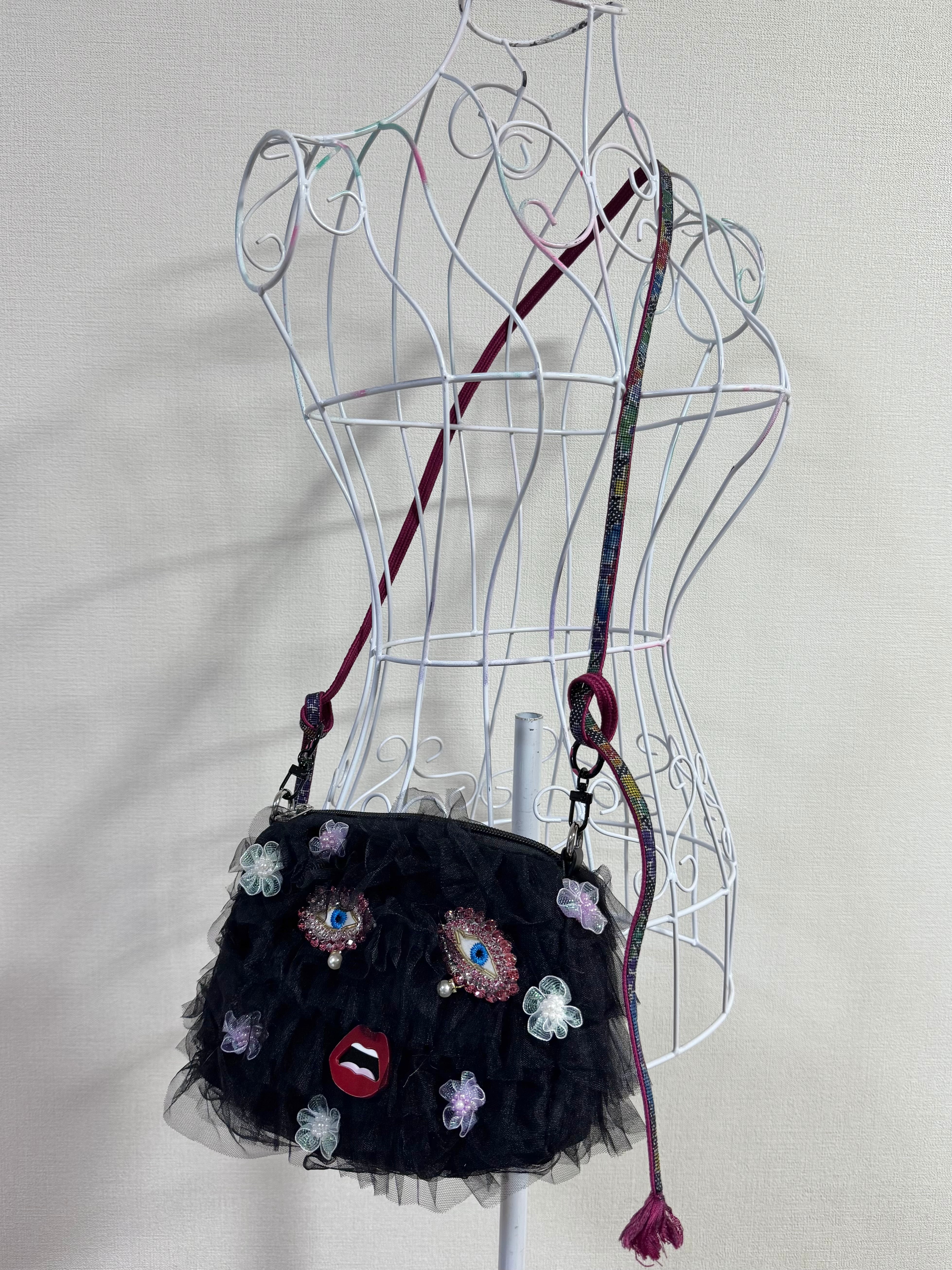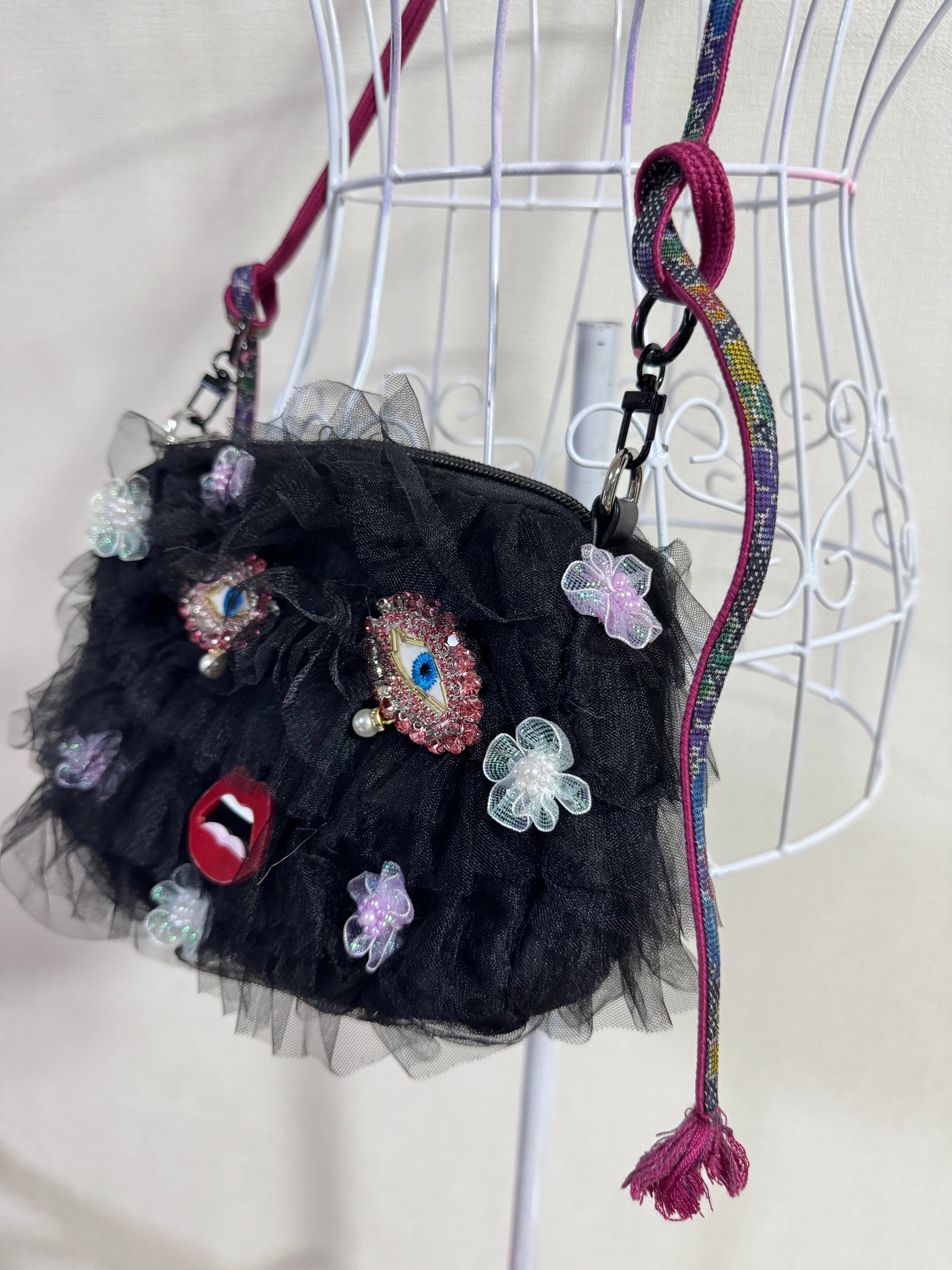 ふわふわの黒チュールにキラキラのビジューアイ、パールの涙、淡いお花のモチーフがゆらゆら揺れて、闇と可愛さがコラボしたミステリアスな子☺️