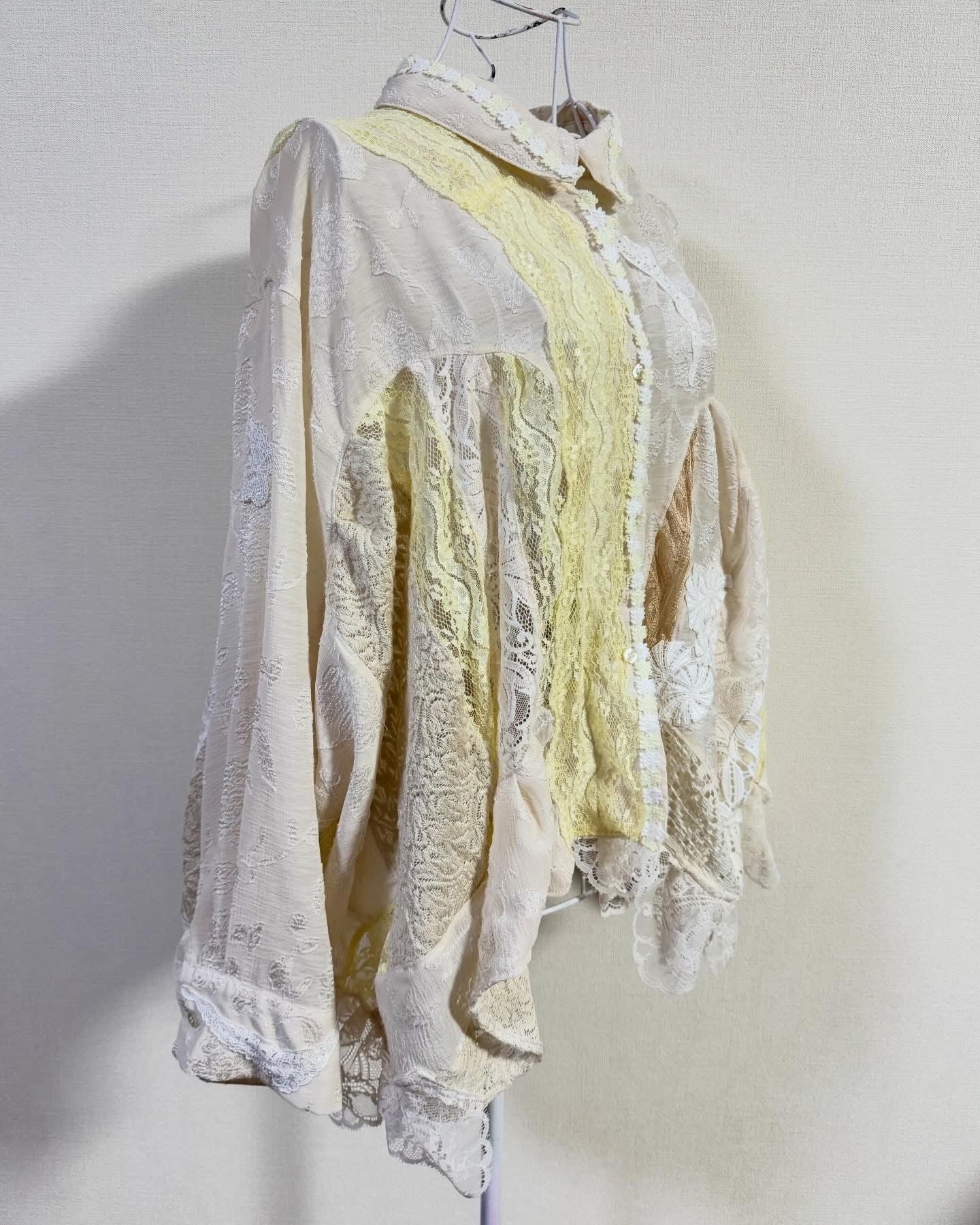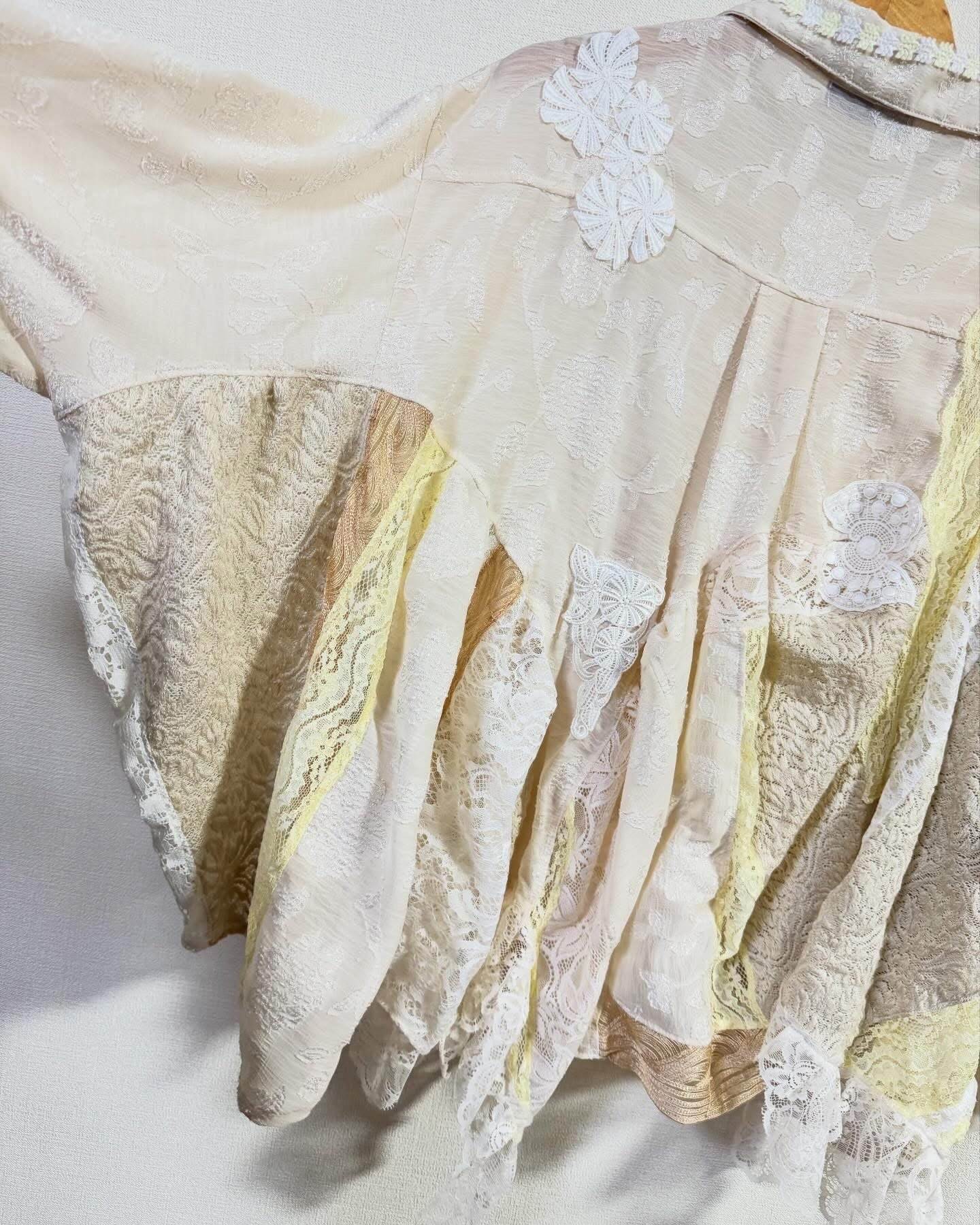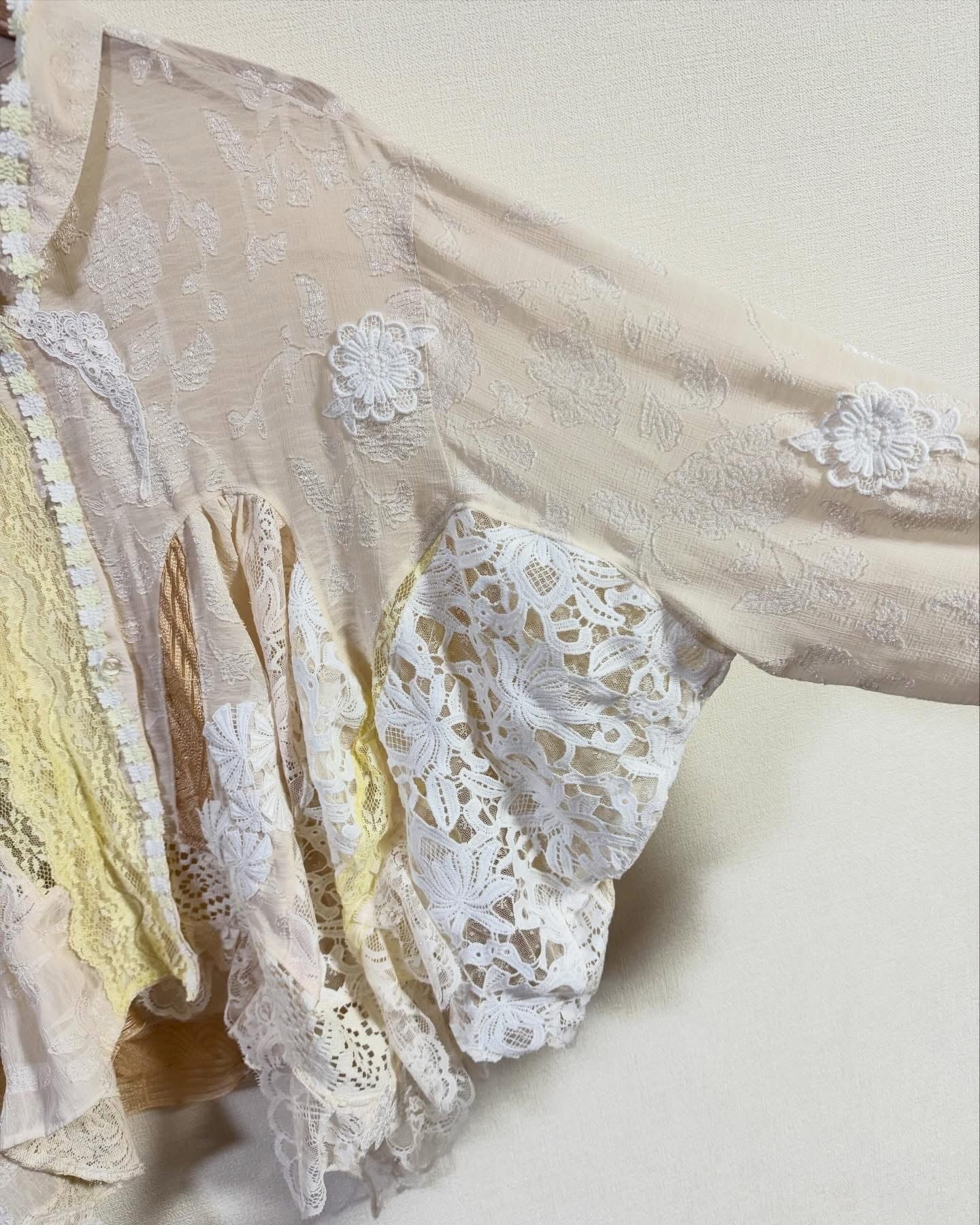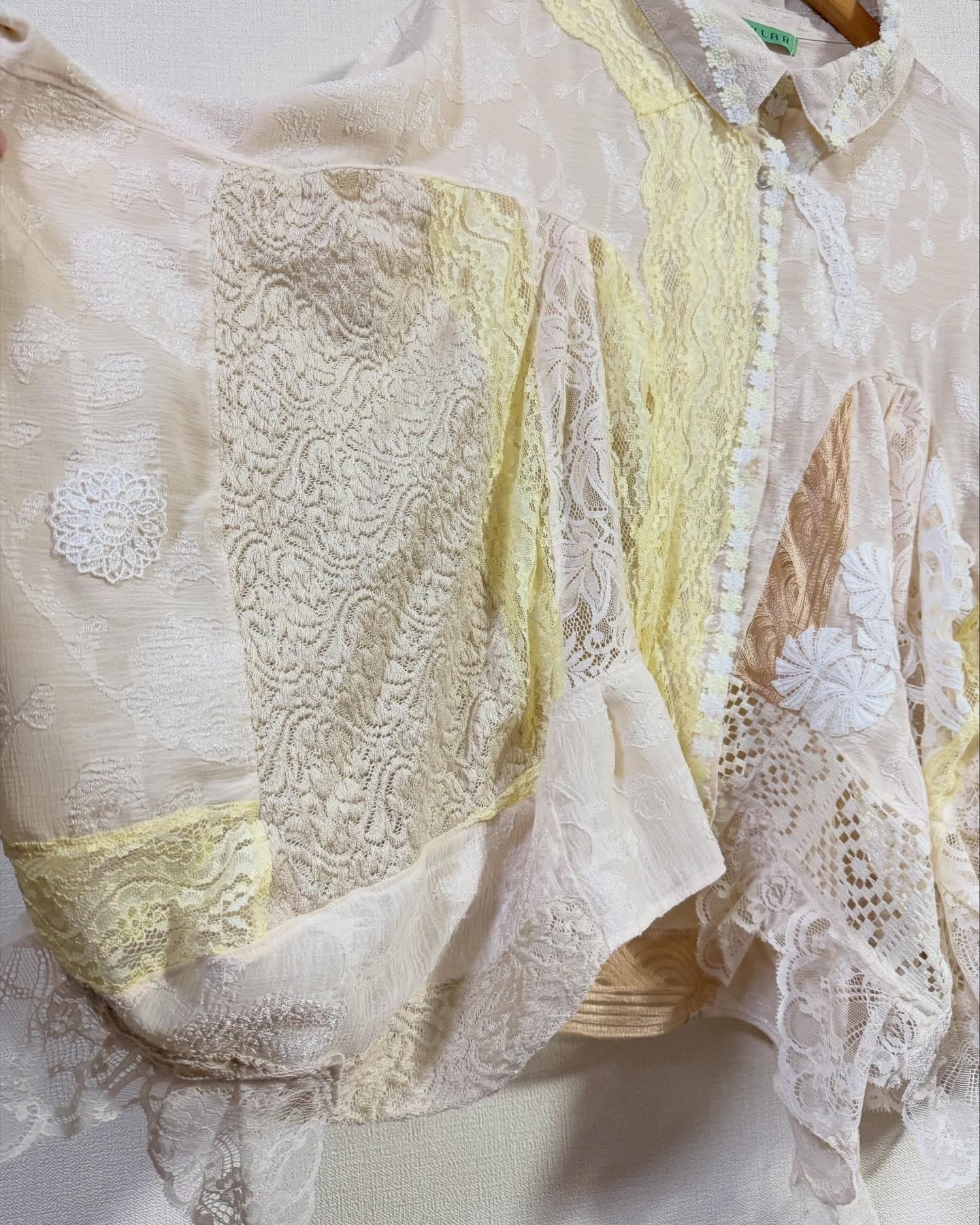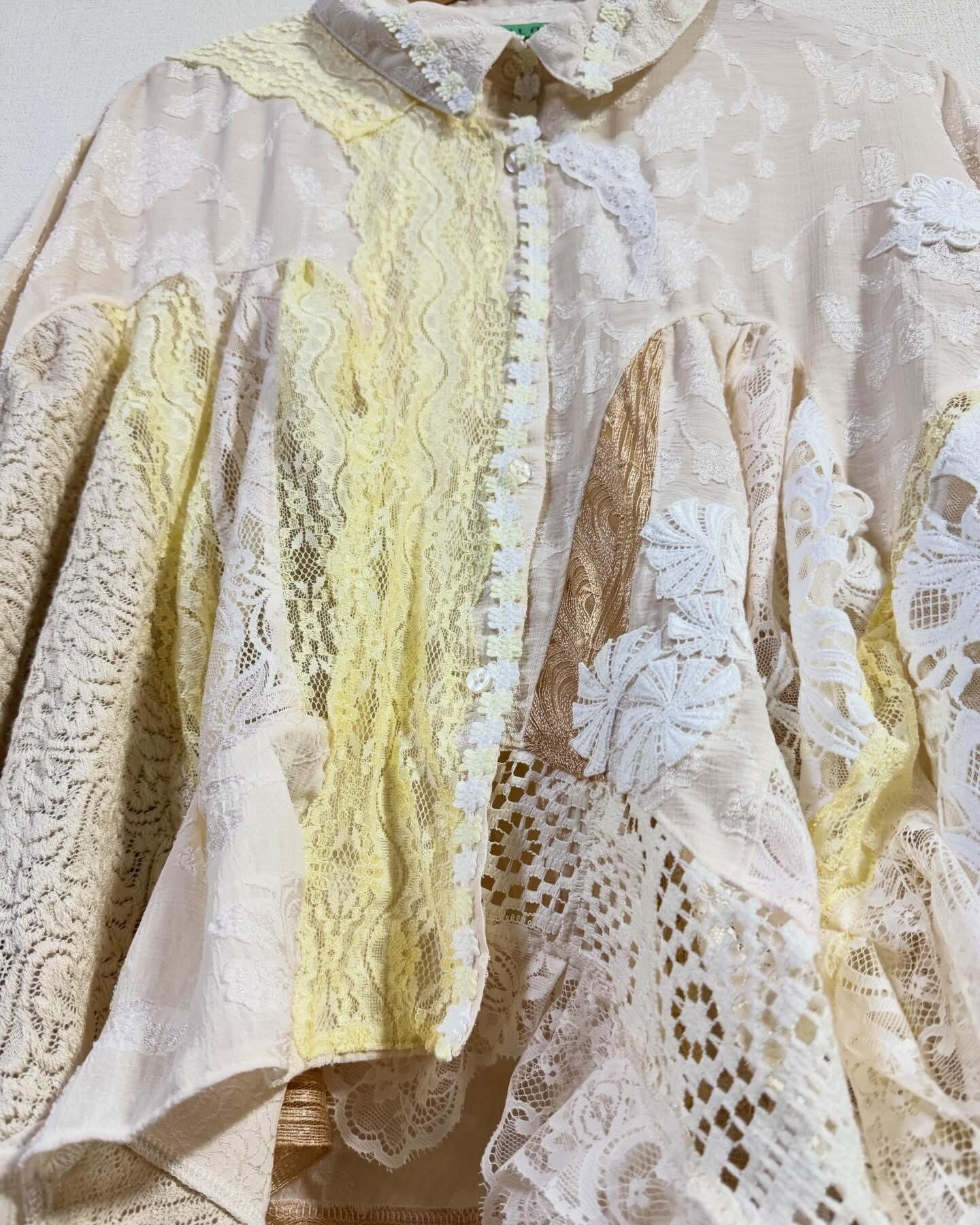 白、アイボリー、淡いイエロー、色々なレースを集めてリメイクしたトップス。