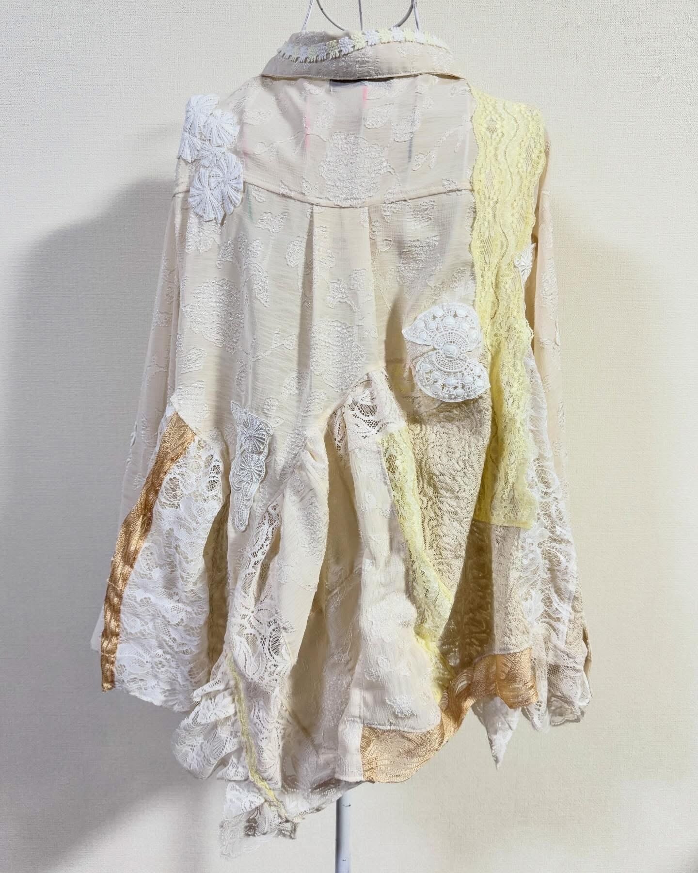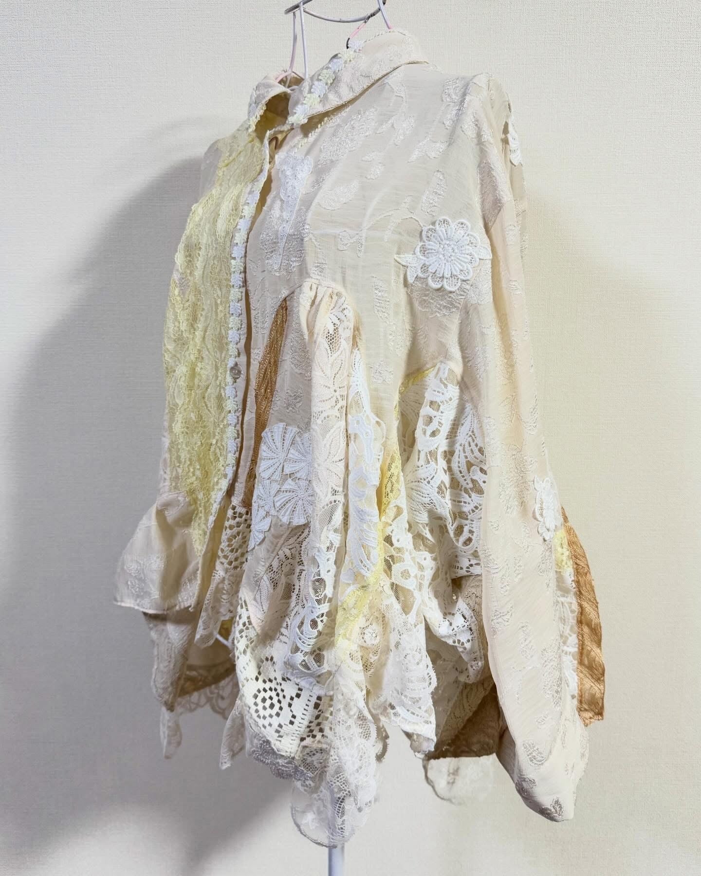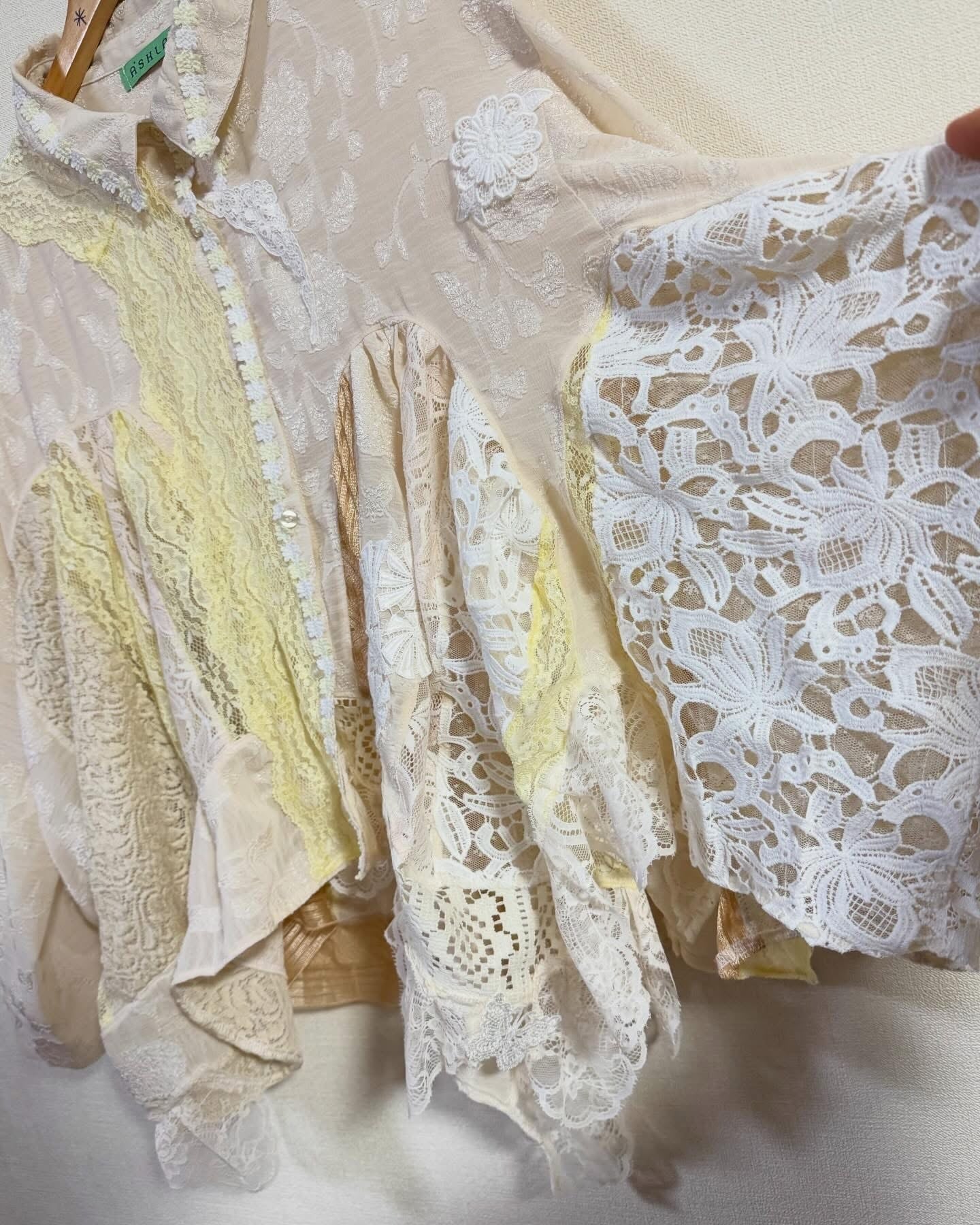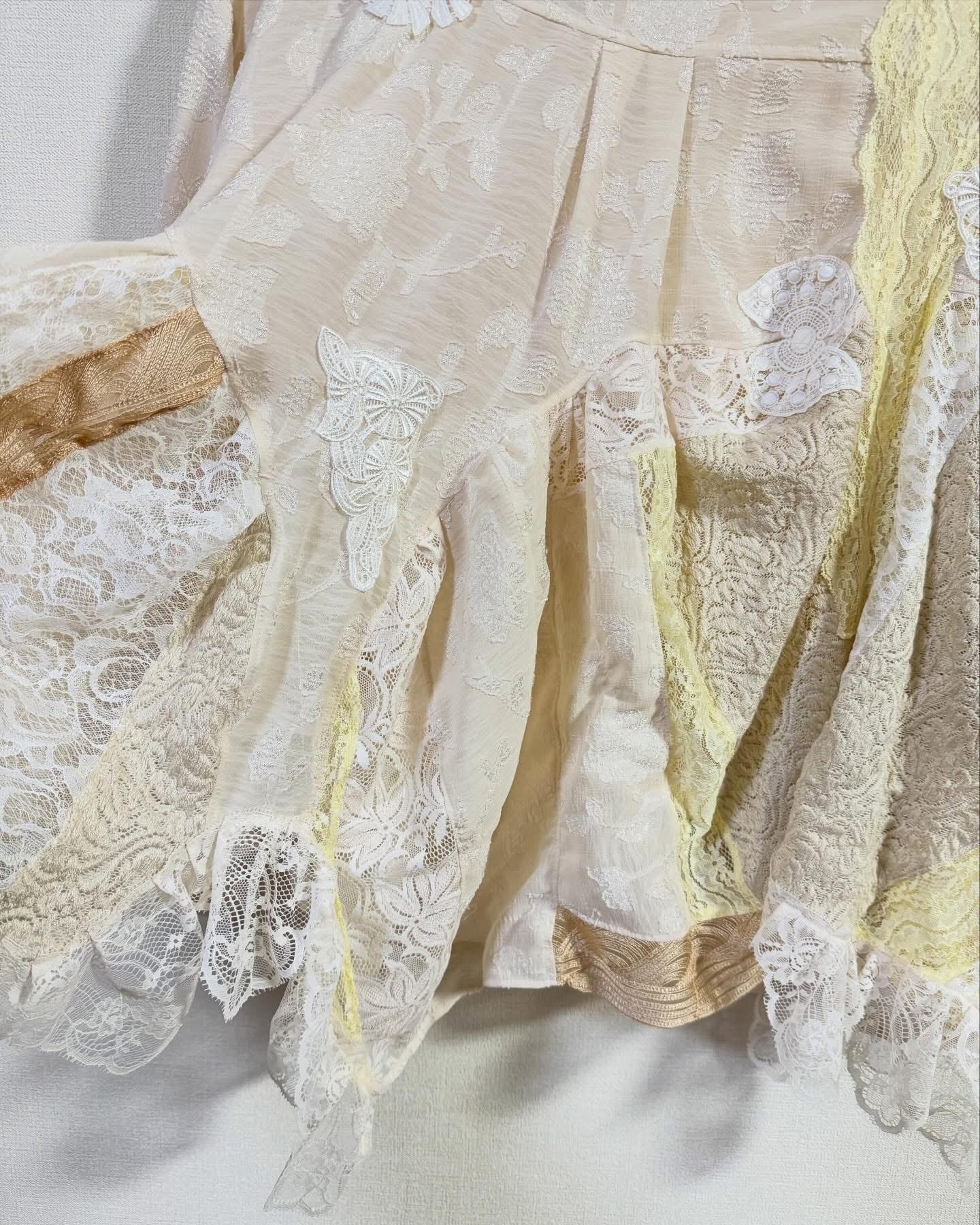 白、アイボリー、淡いイエロー、色々なレースを集めてリメイクしたトップス。