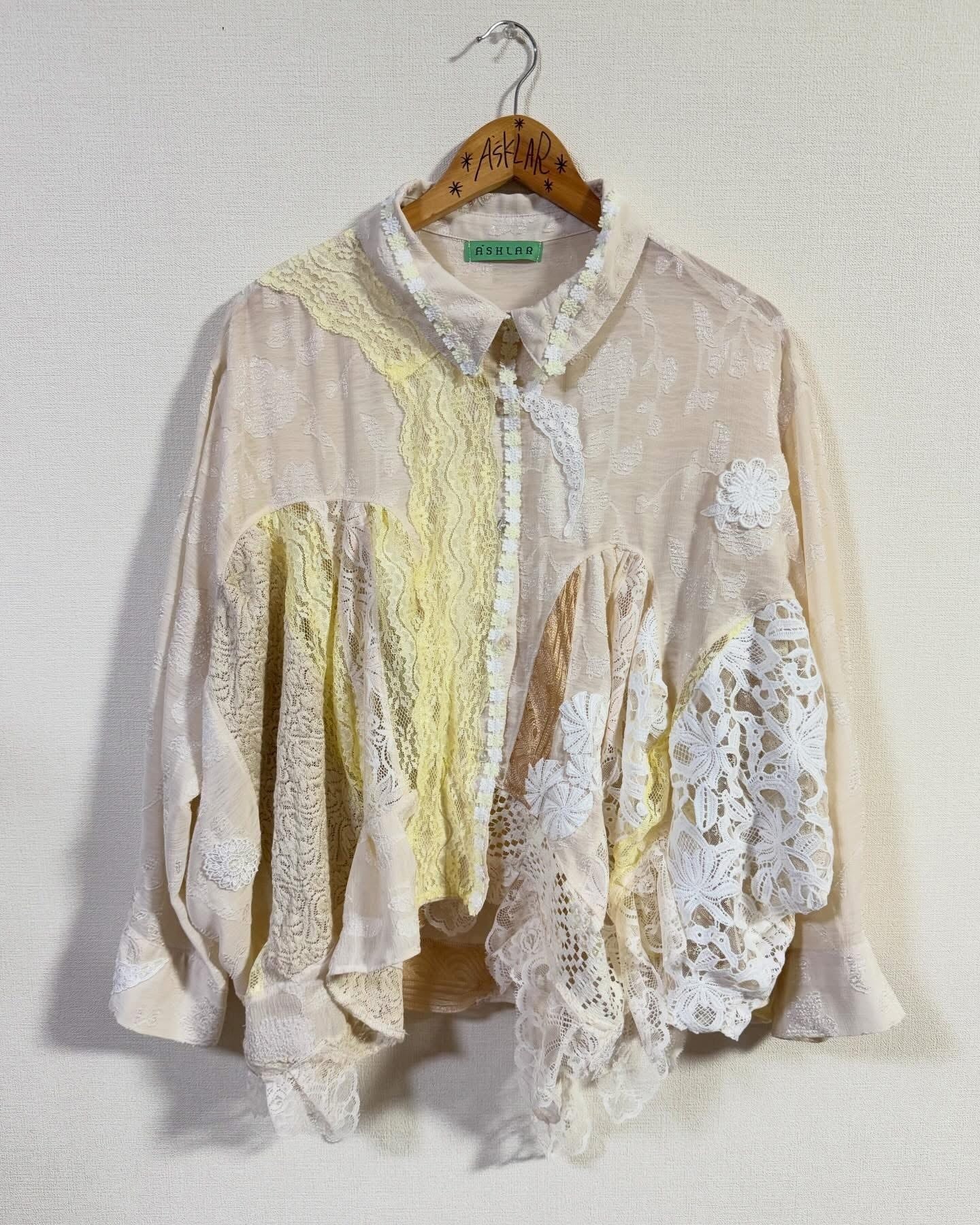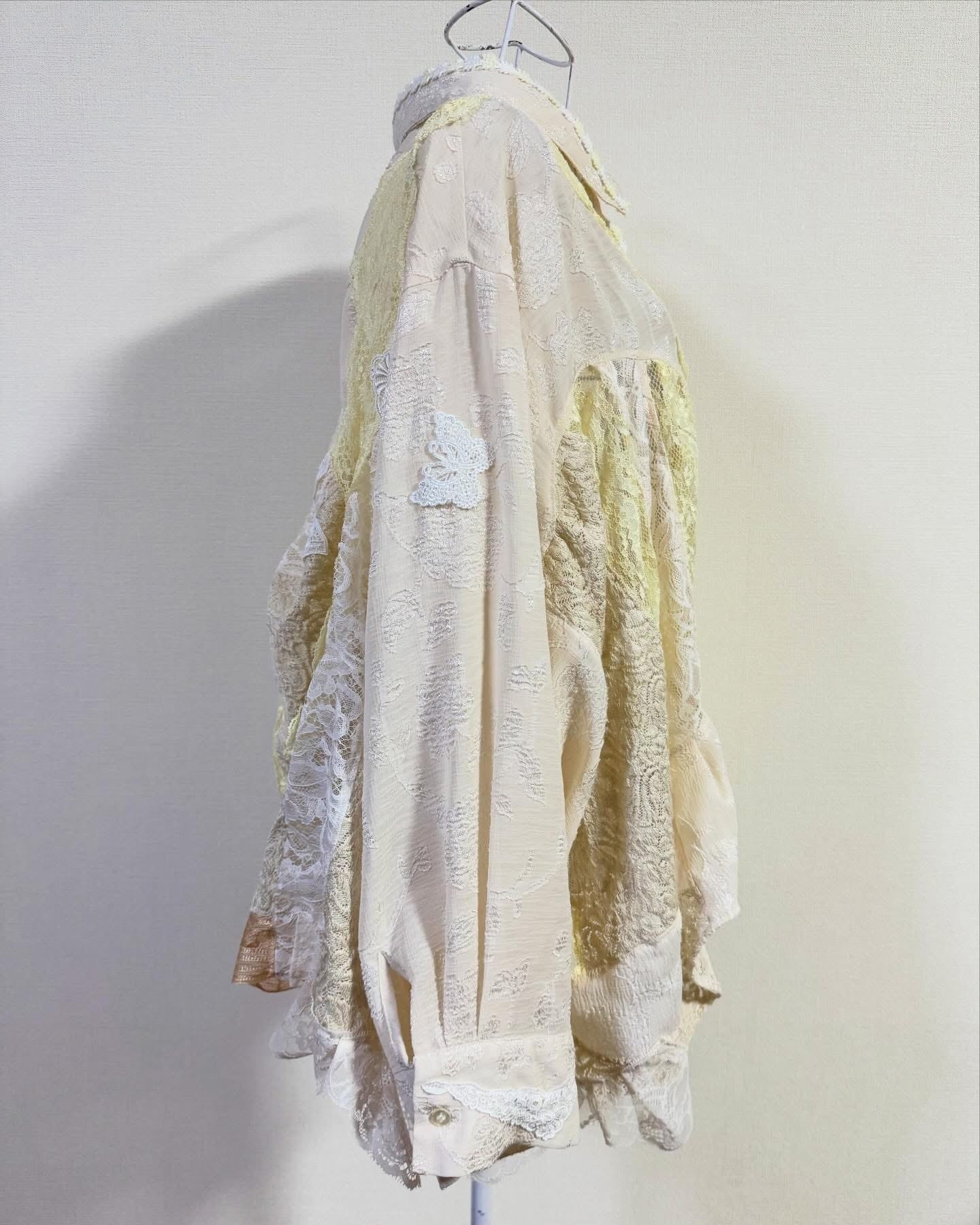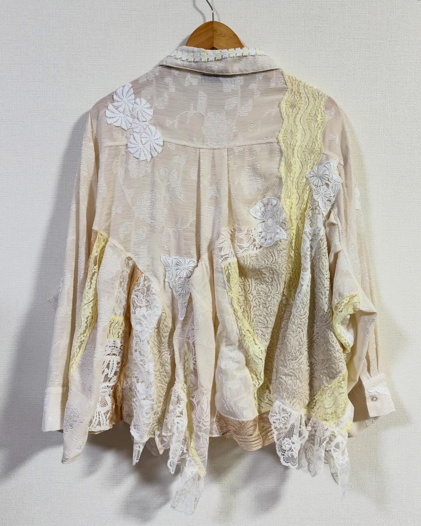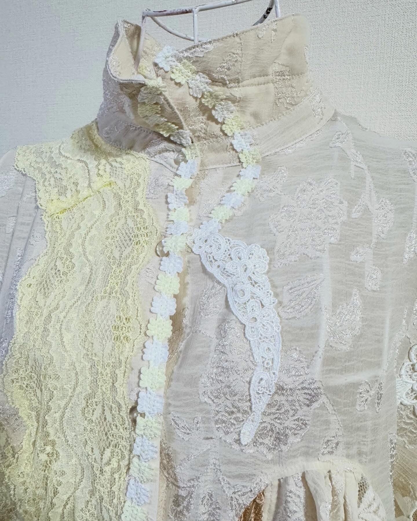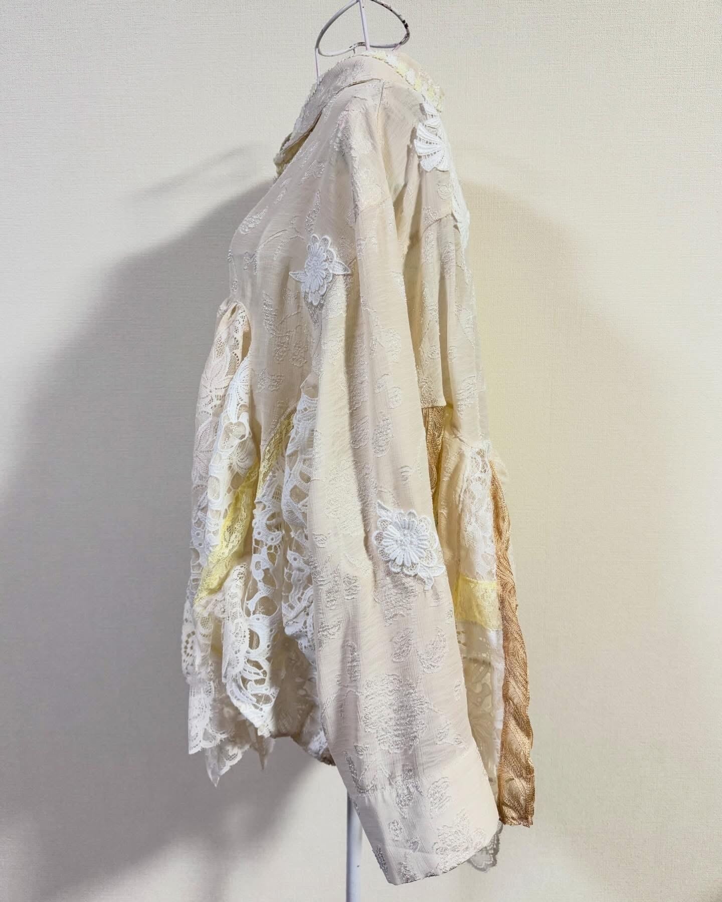 白、アイボリー、淡いイエロー、色々なレースを集めてリメイクしたトップス。