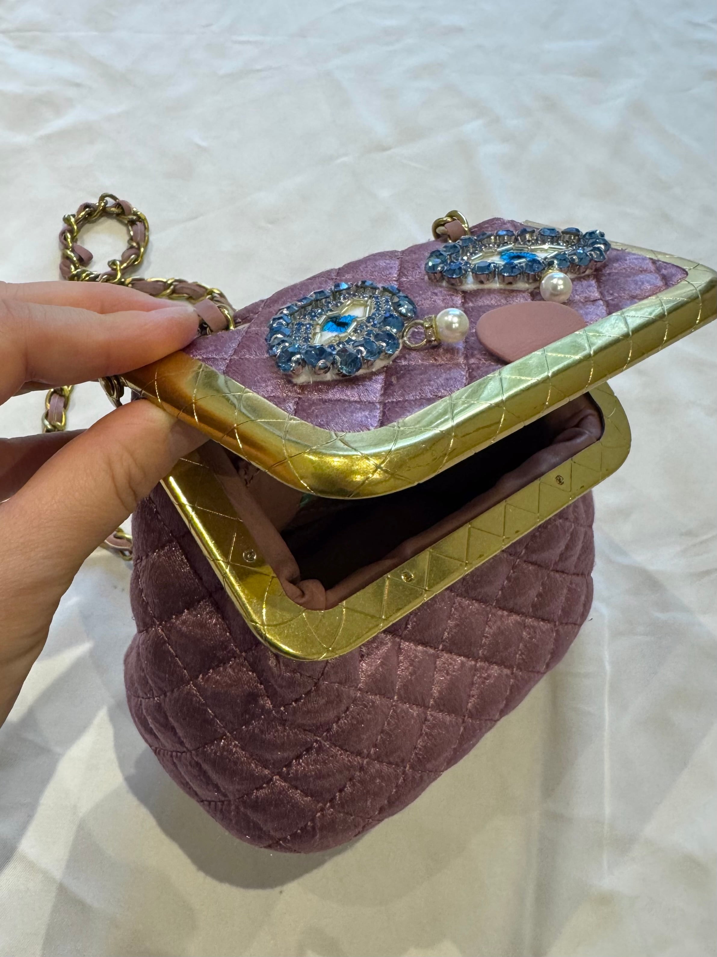 くすみピンクのふわふわキルティングに、ブルーのビジューアイが映えるとびきりドリーミーな一点もの☺️