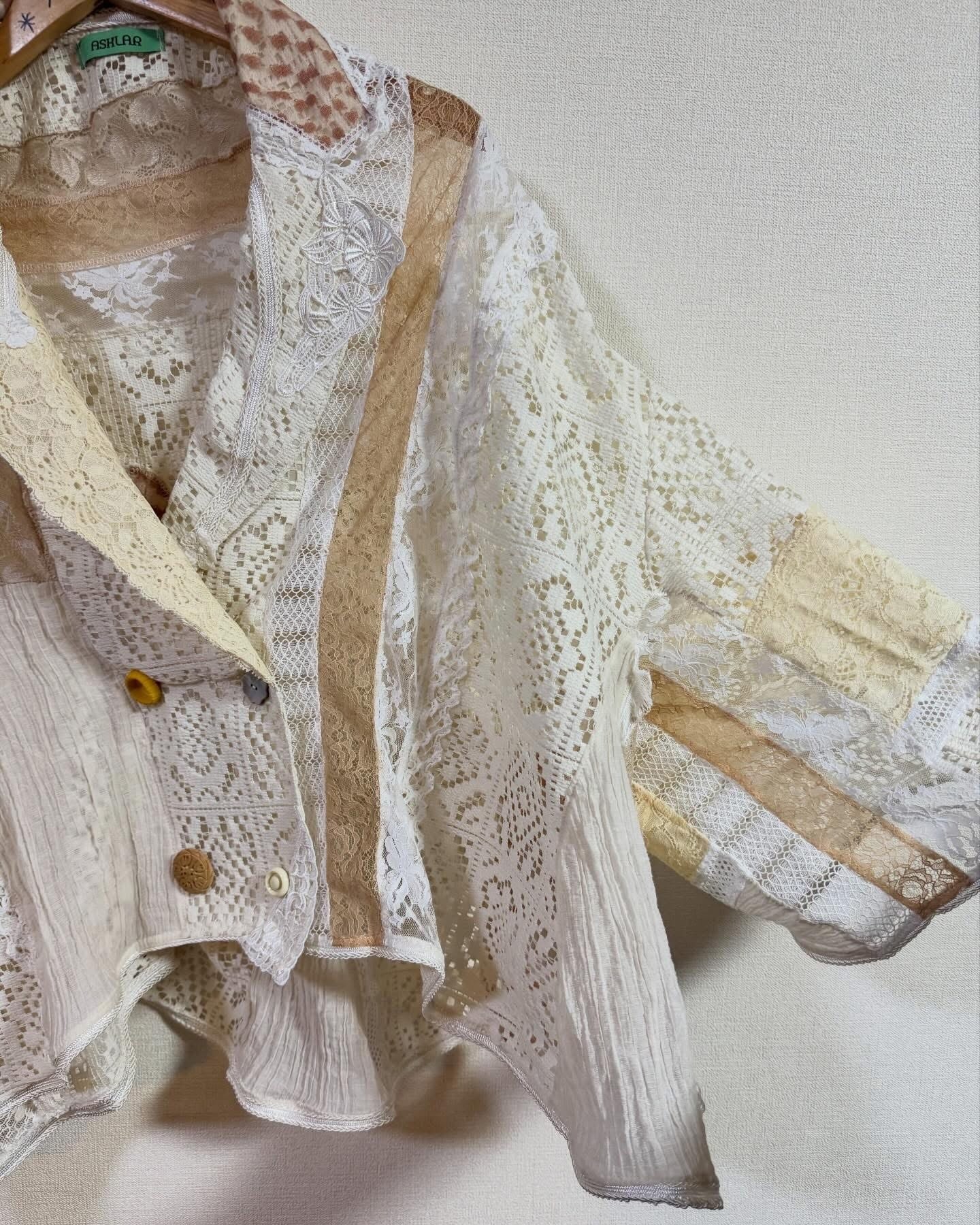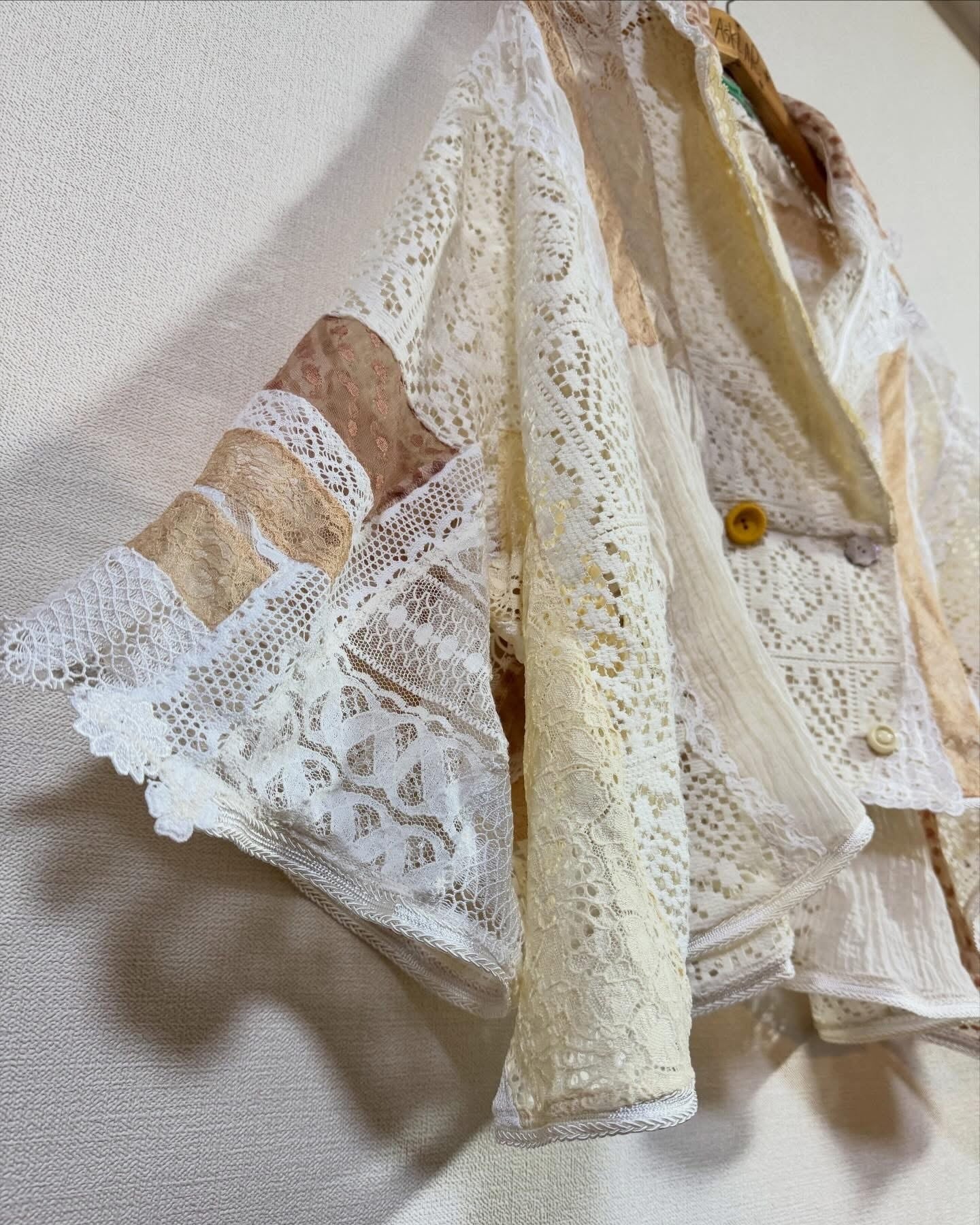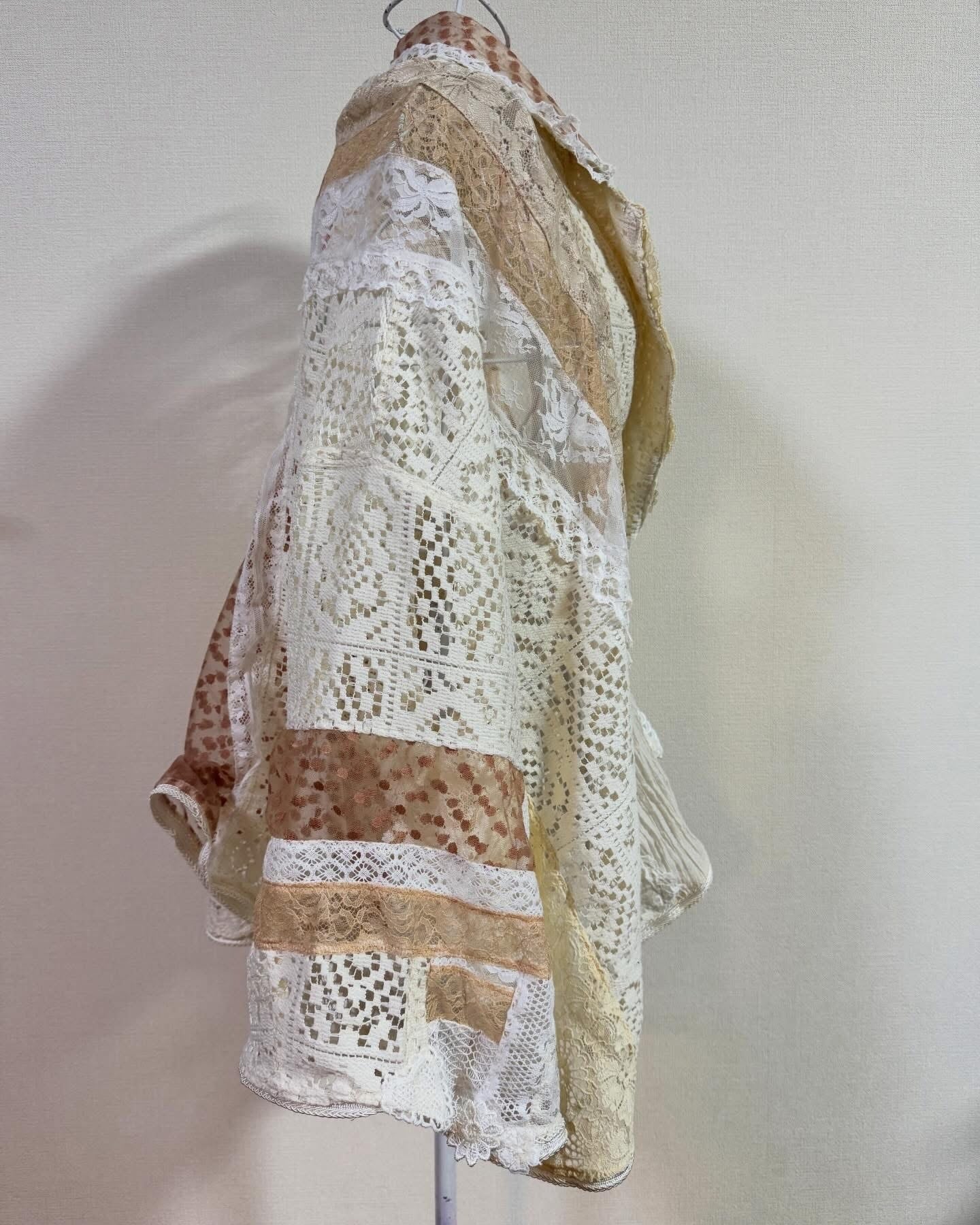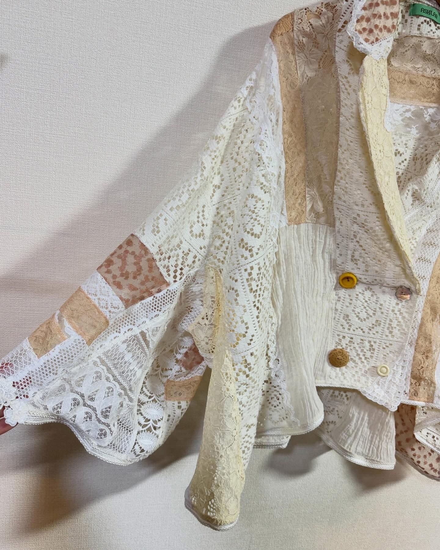いろんなレースをぎゅっと集めて、ふわっと軽やかに仕上げたクレイジーパッチワークのレースジャケット。