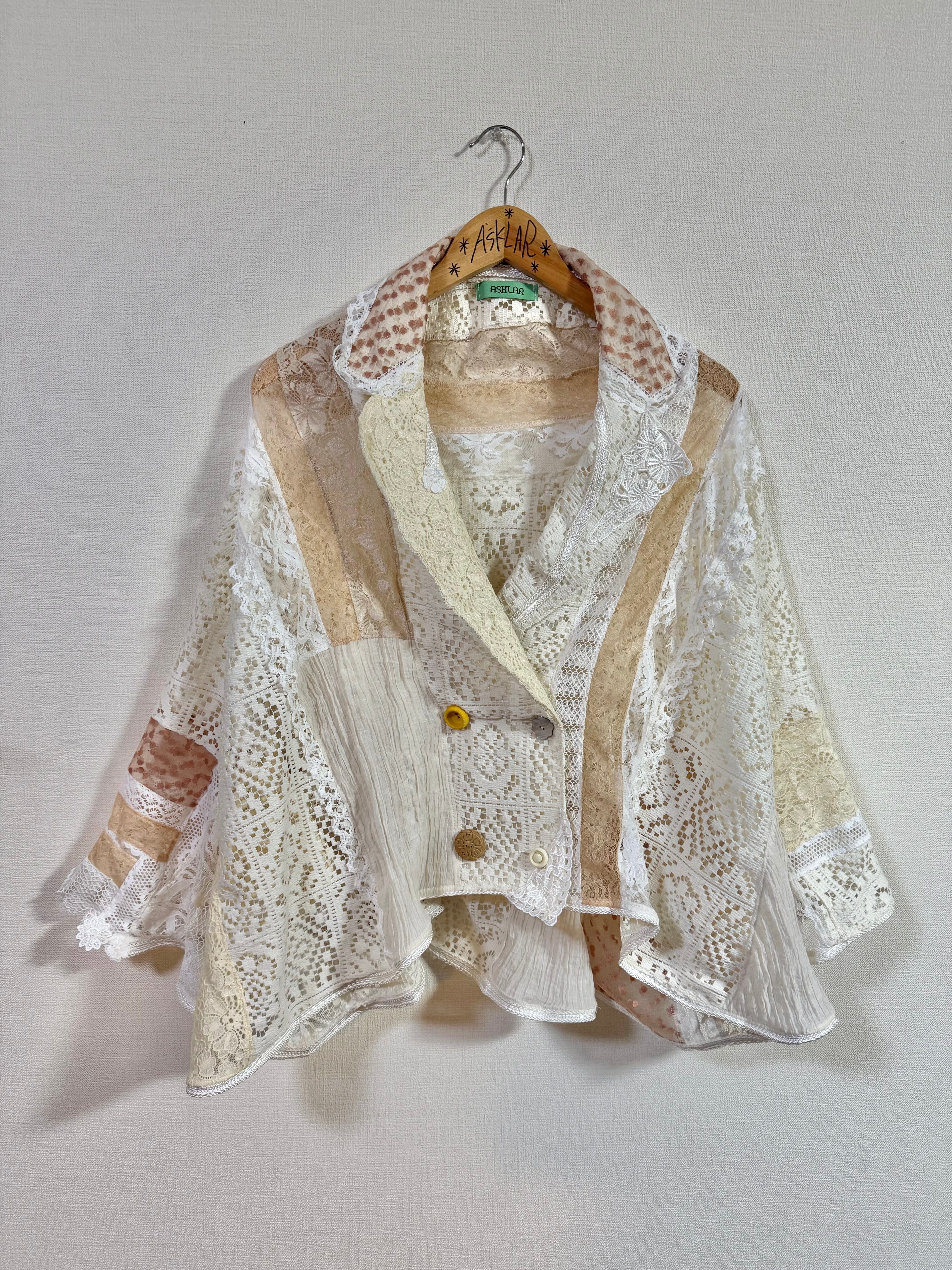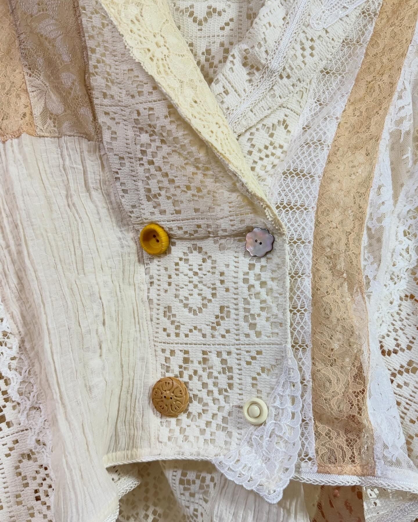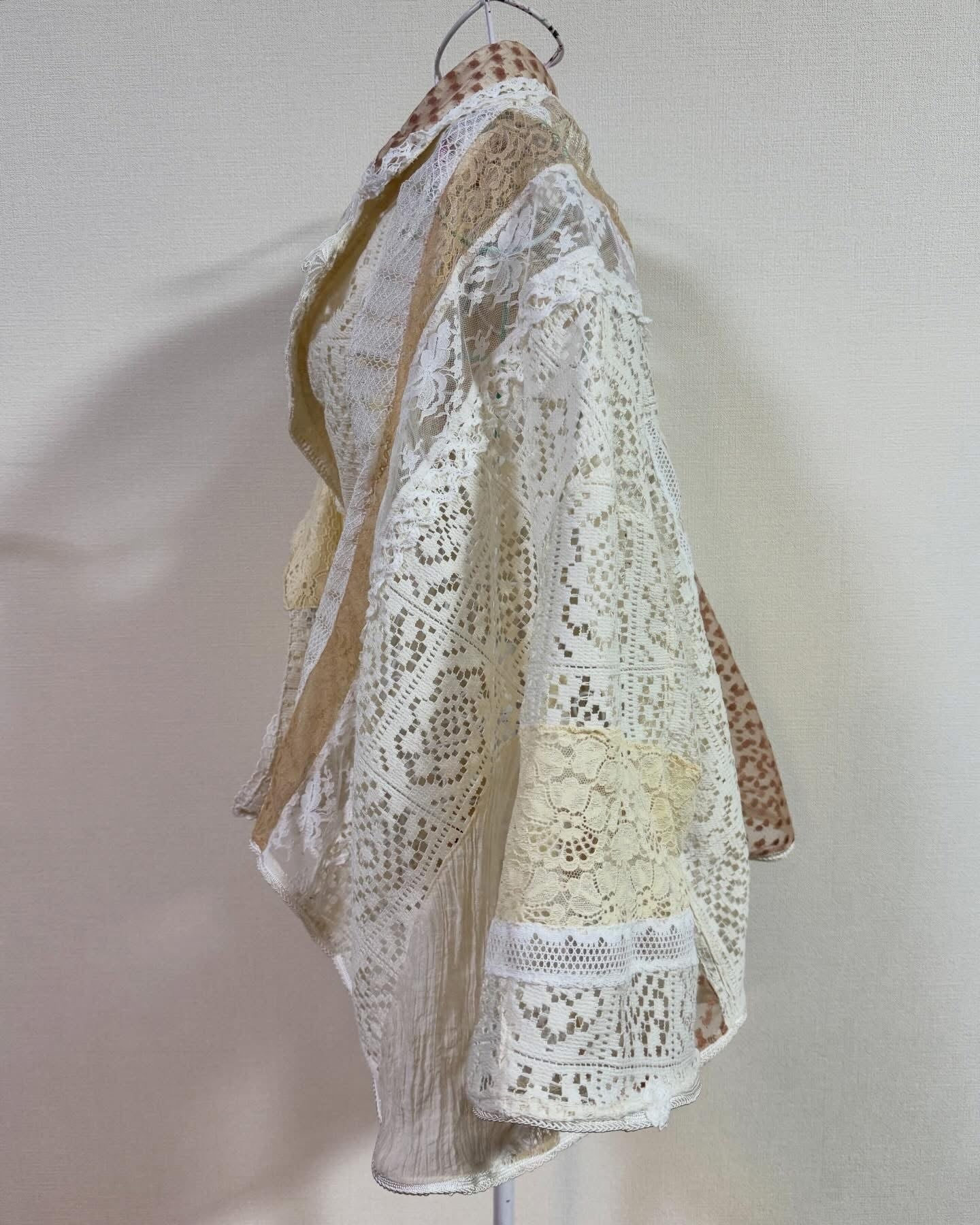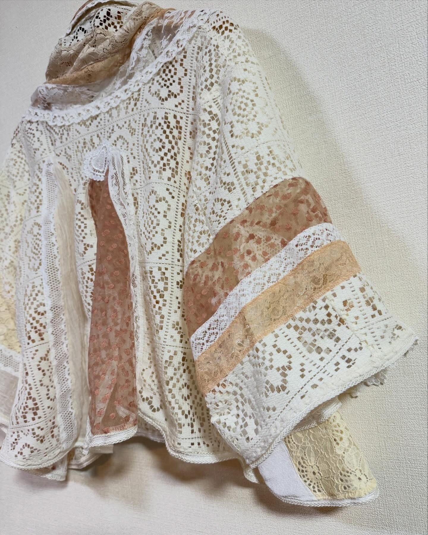 いろんなレースをぎゅっと集めて、ふわっと軽やかに仕上げたクレイジーパッチワークのレースジャケット。