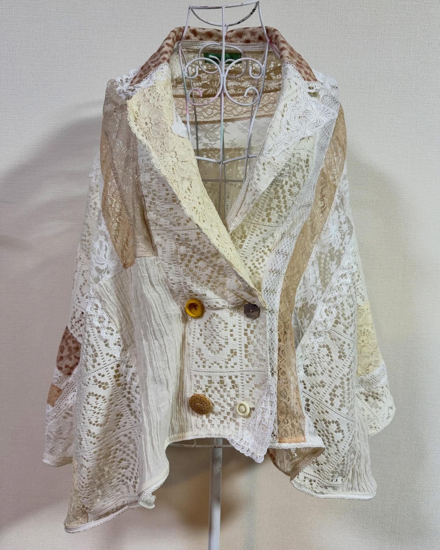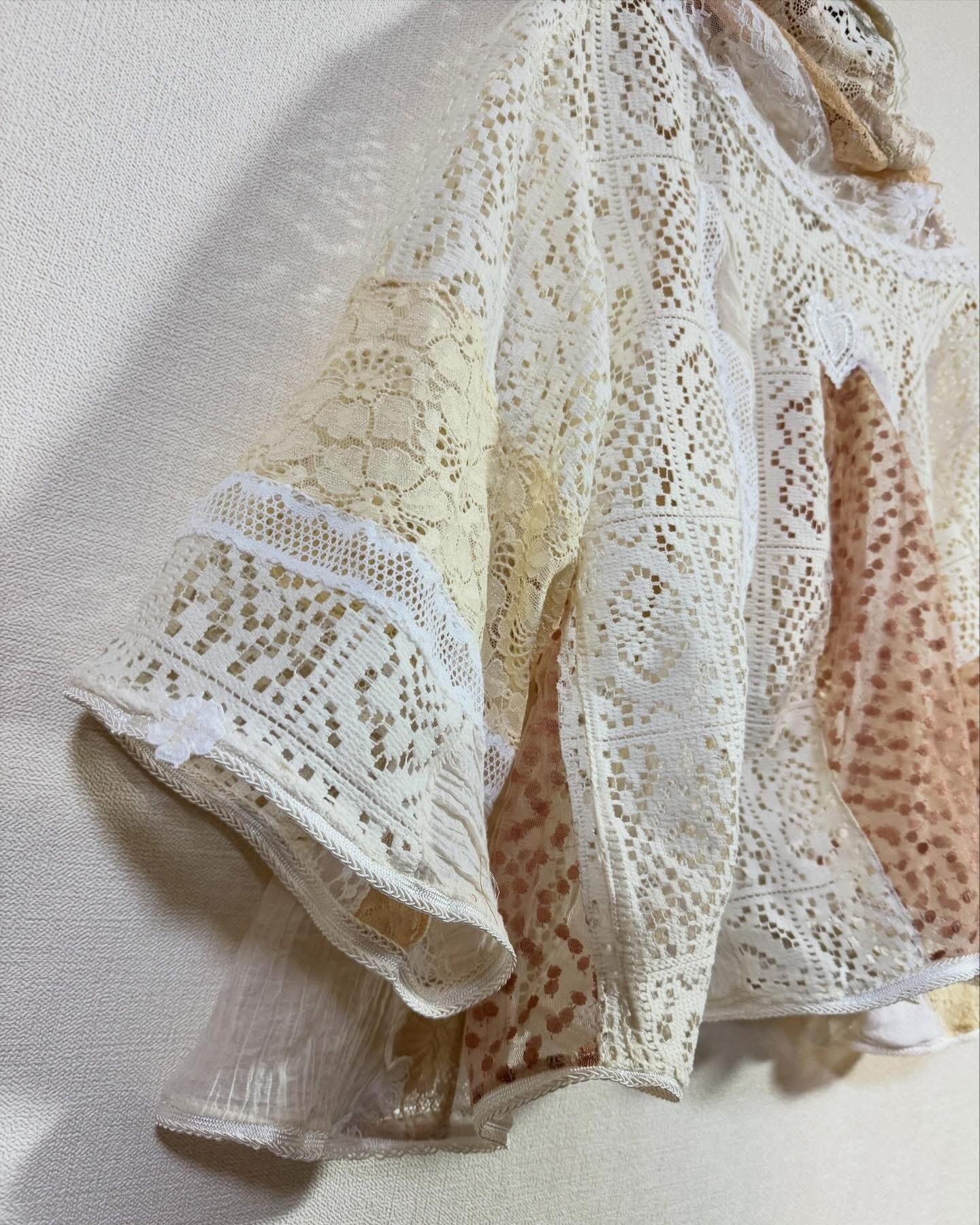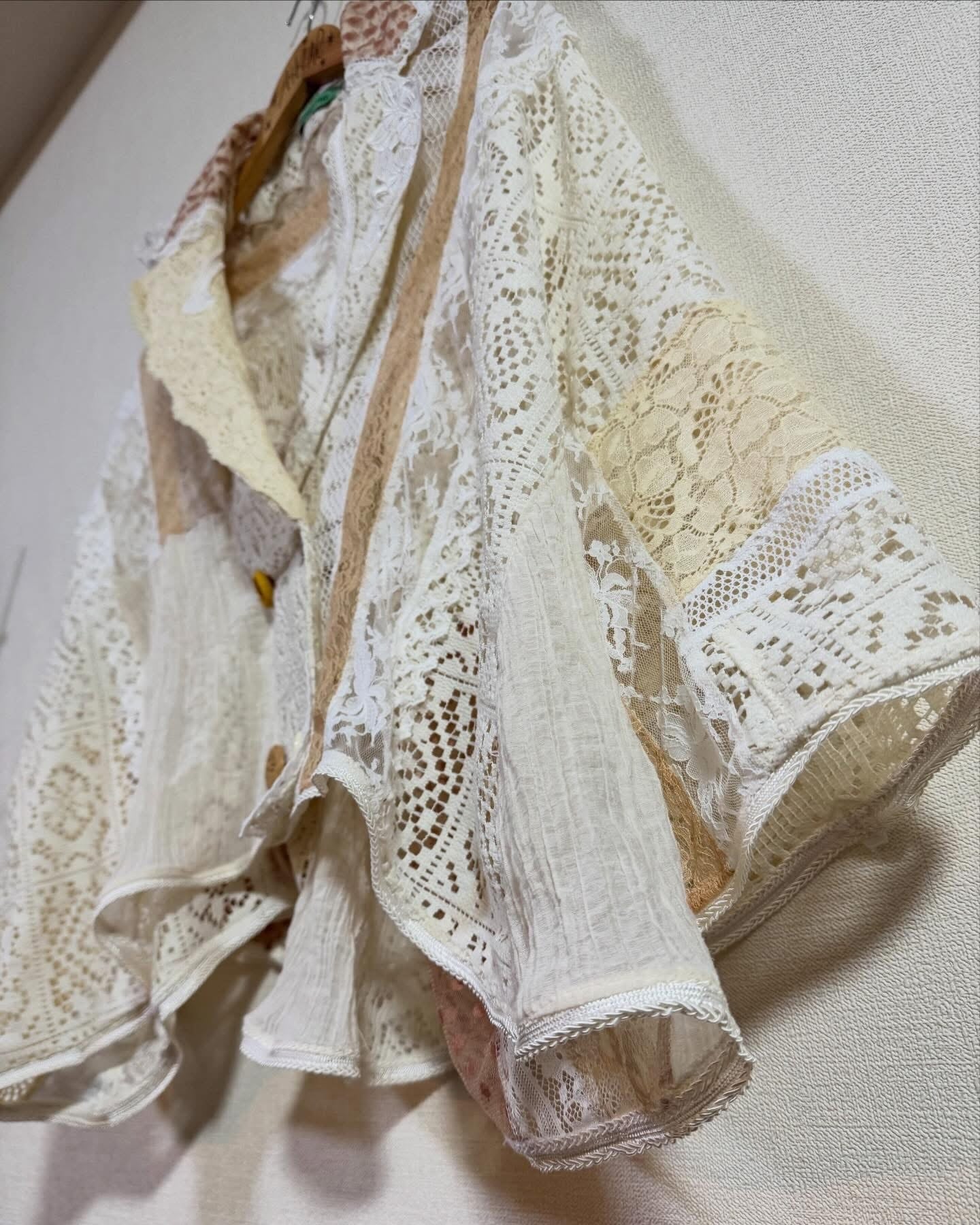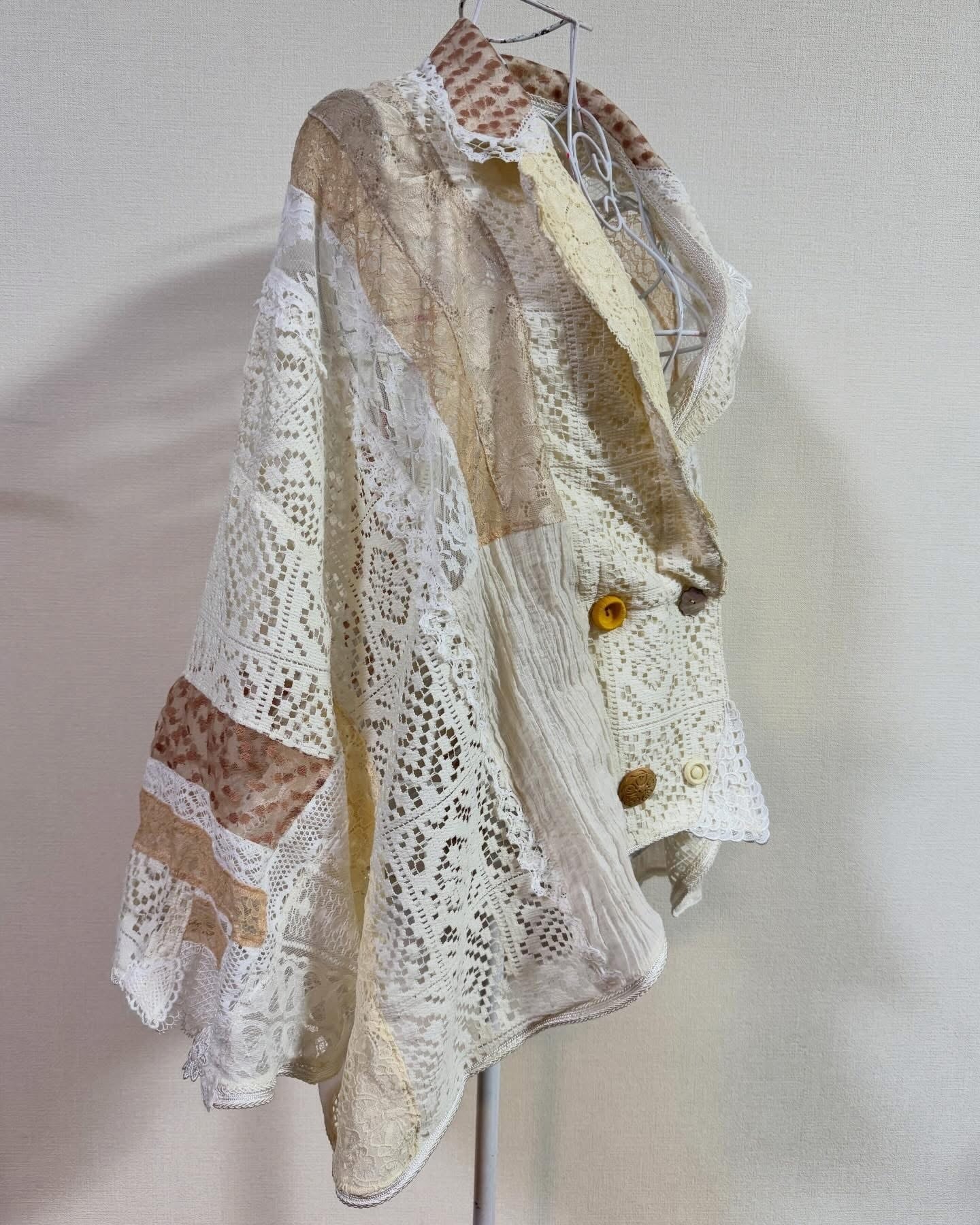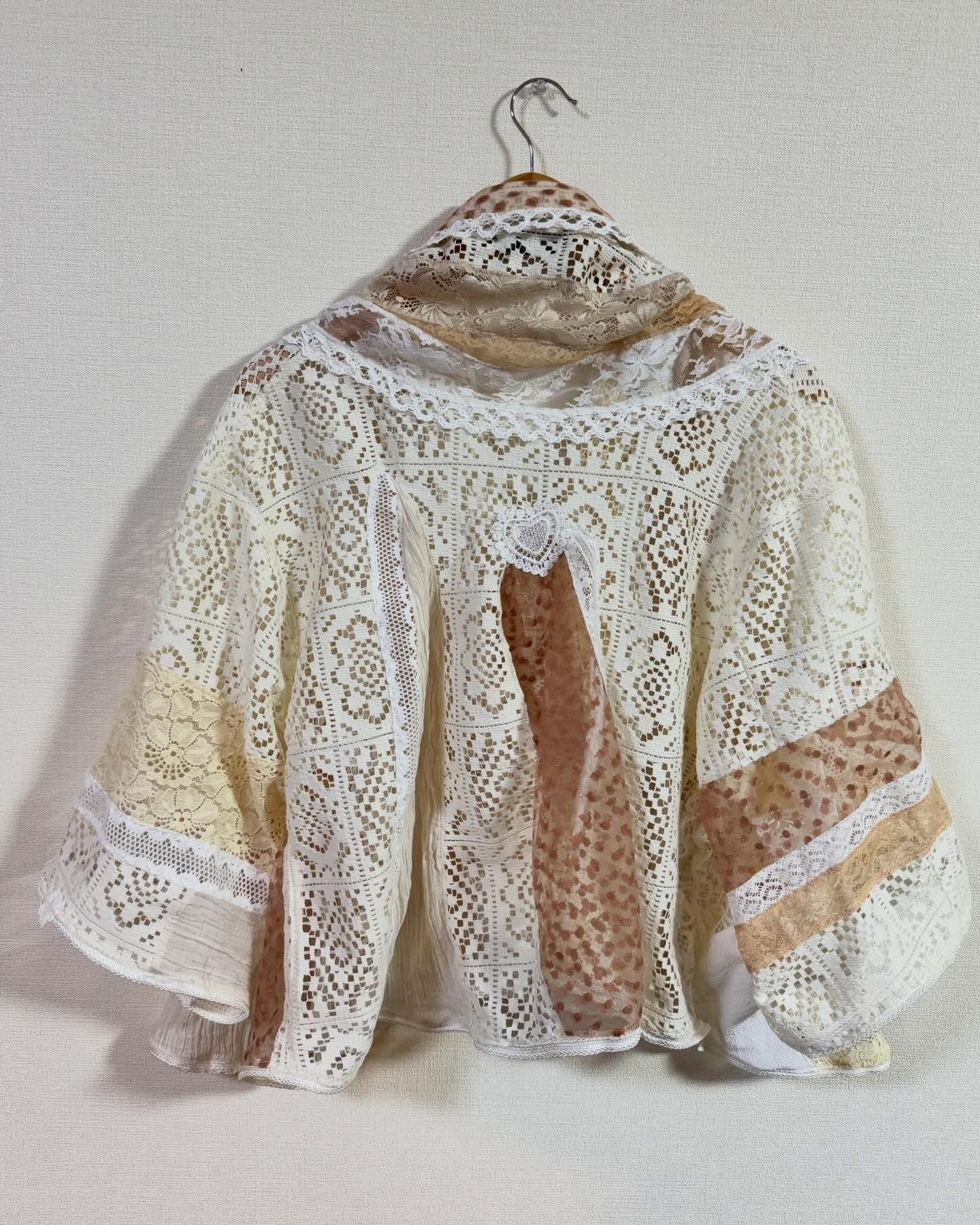 いろんなレースをぎゅっと集めて、ふわっと軽やかに仕上げたクレイジーパッチワークのレースジャケット。
