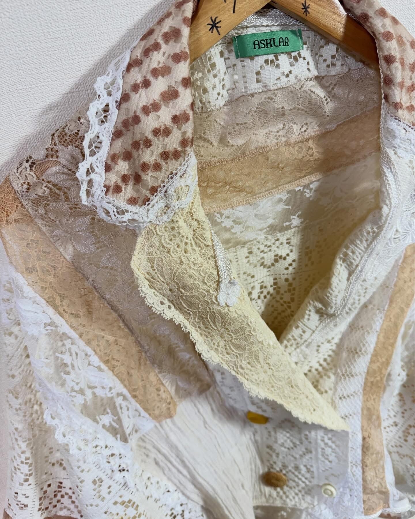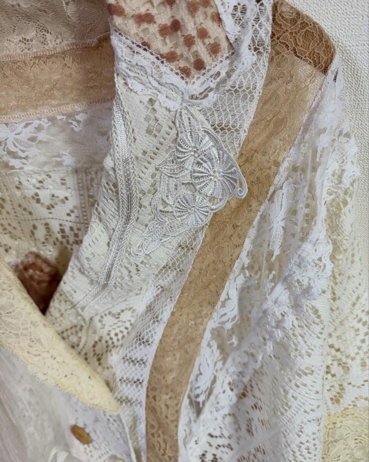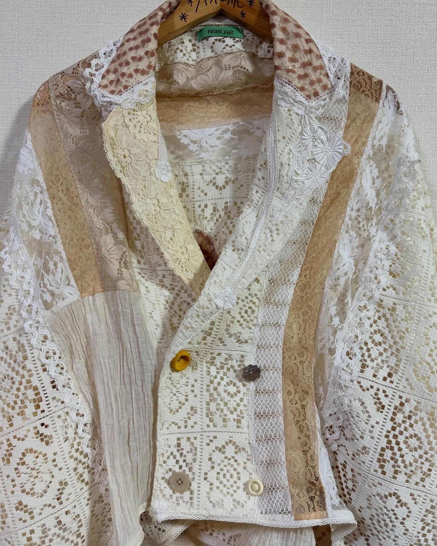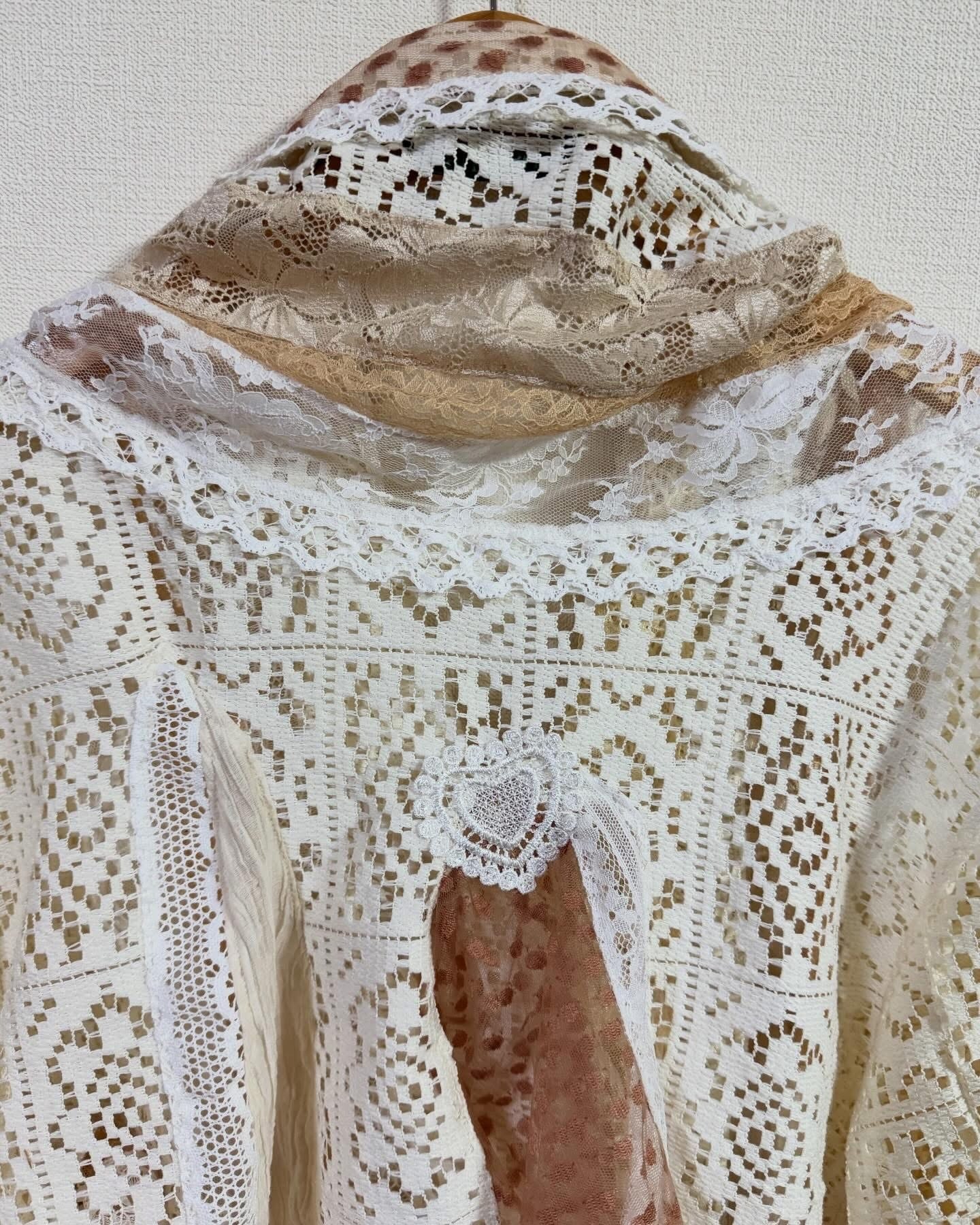 いろんなレースをぎゅっと集めて、ふわっと軽やかに仕上げたクレイジーパッチワークのレースジャケット。