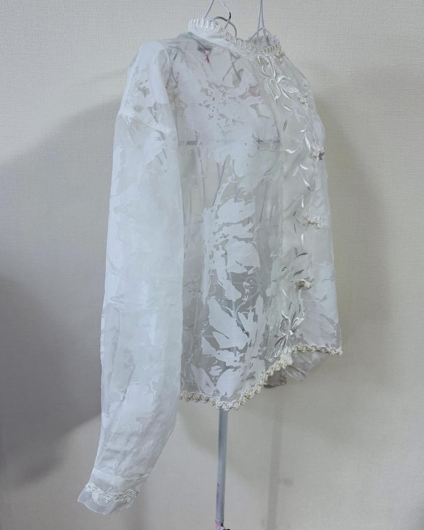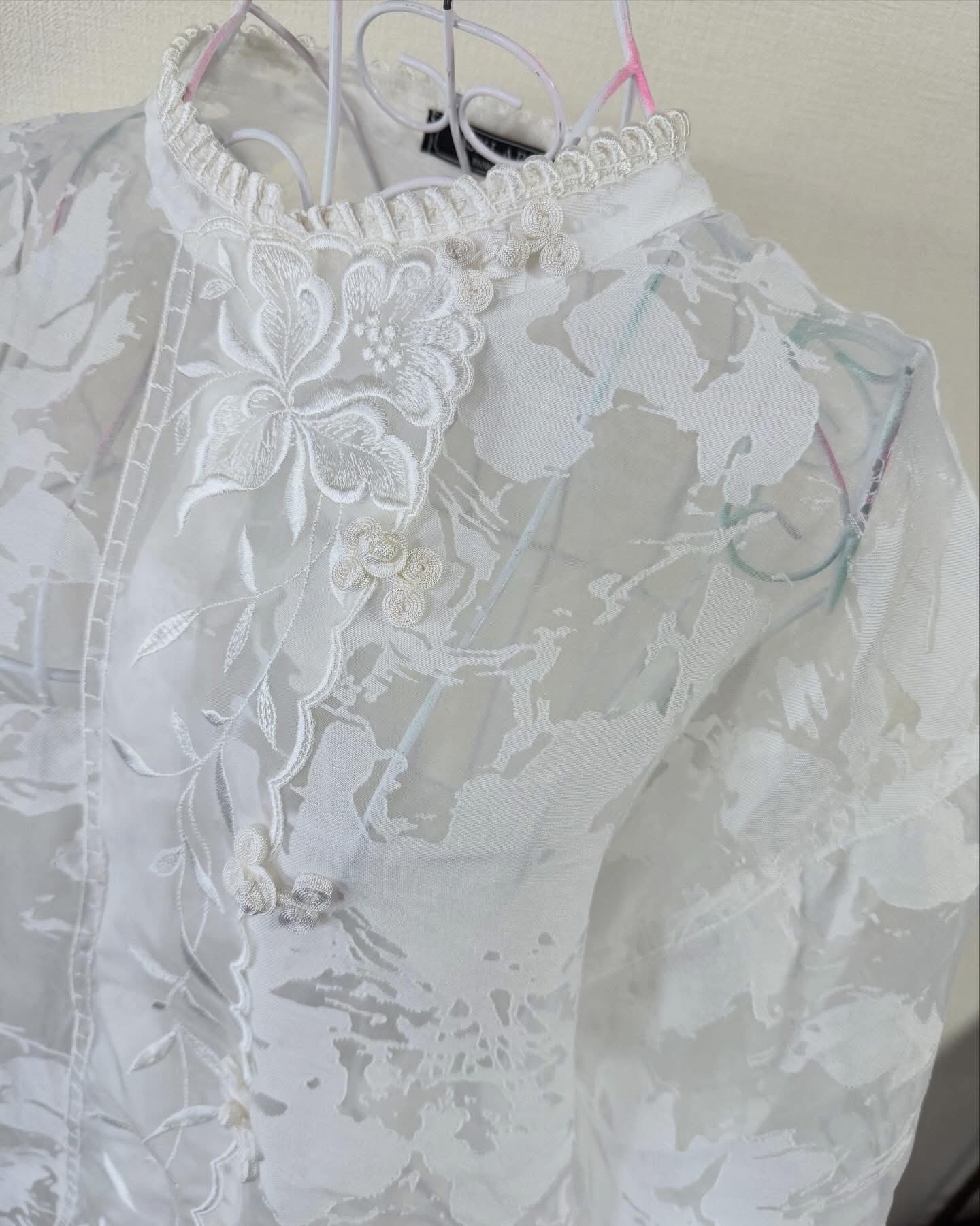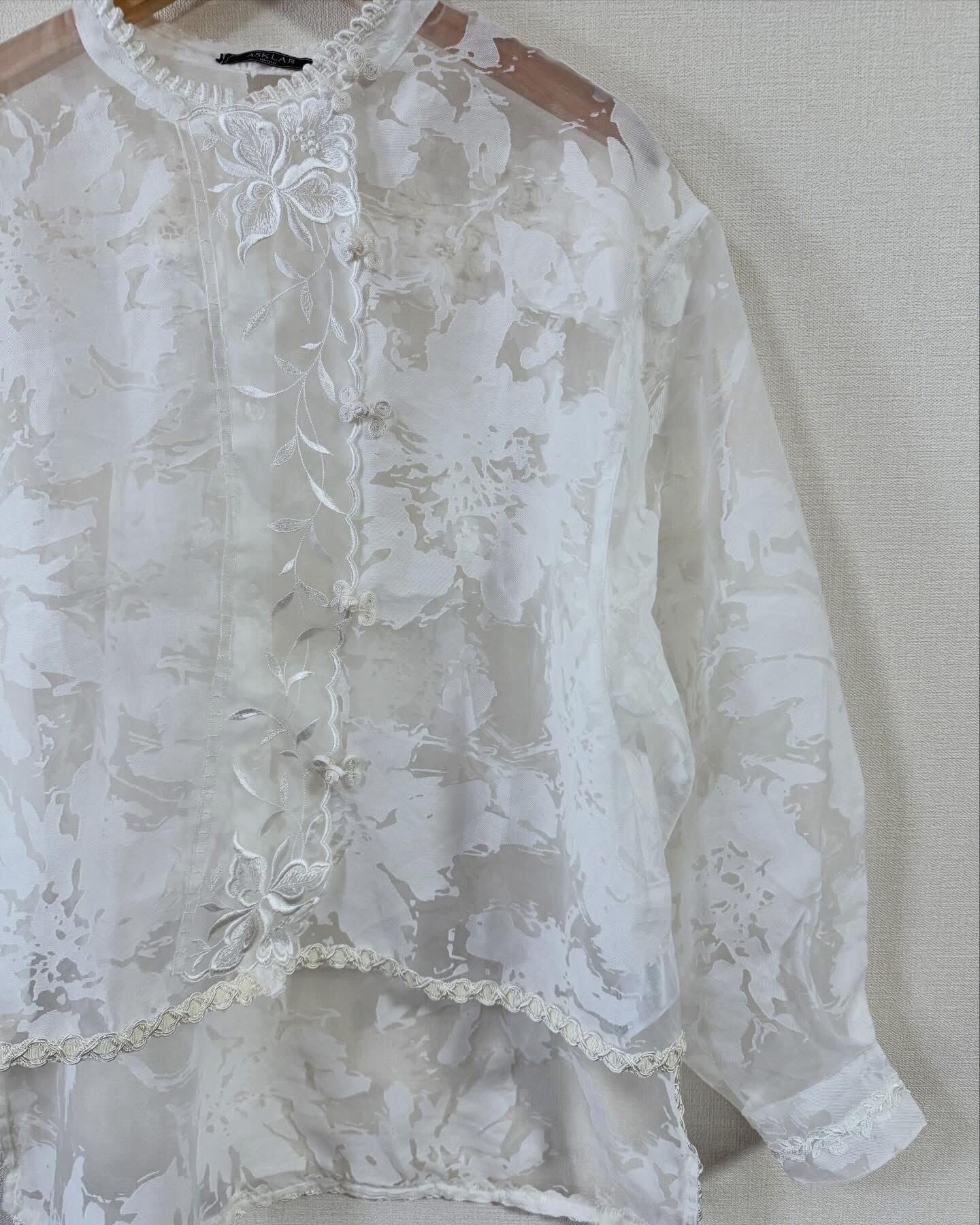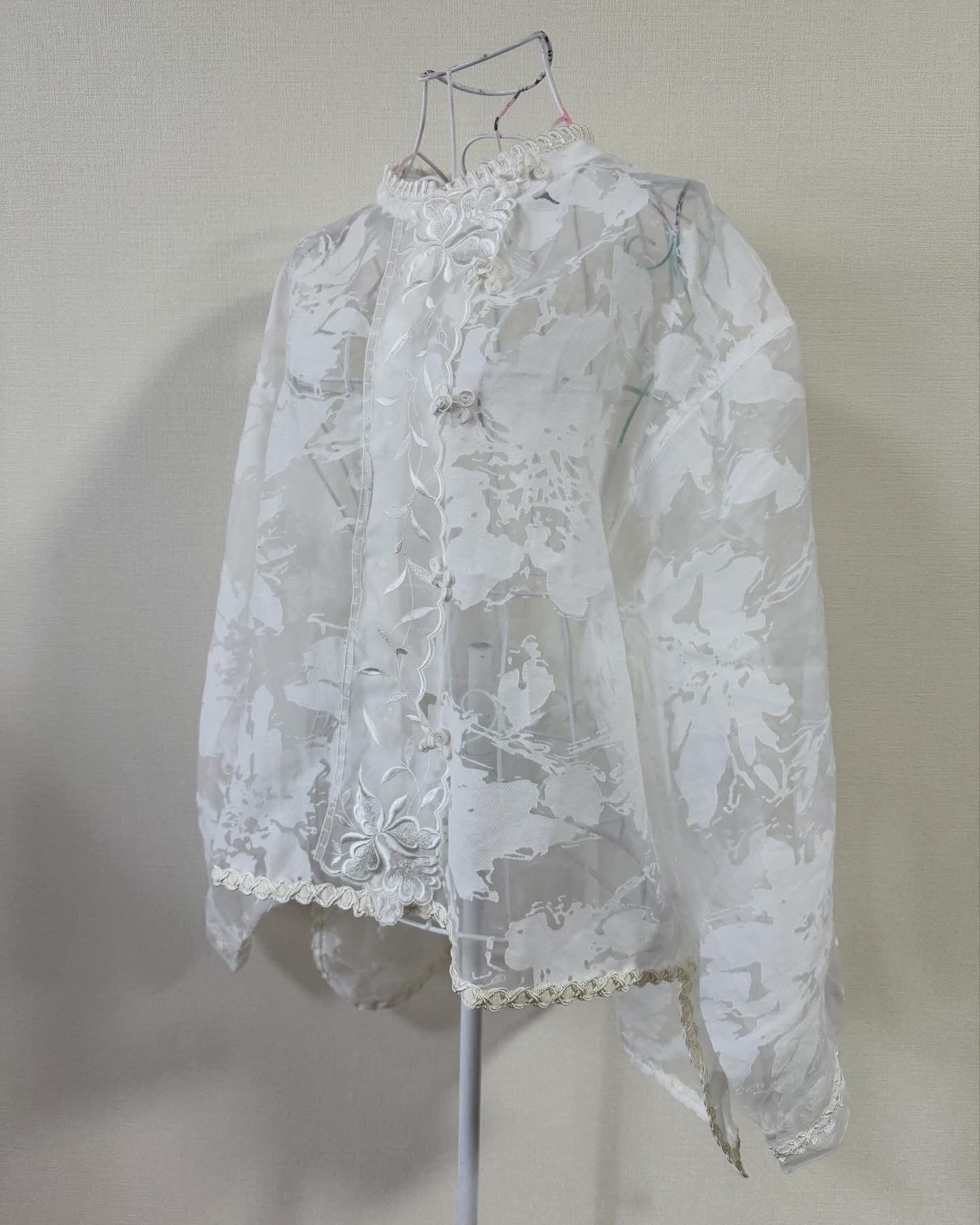 前立てに美しい刺繍モチーフとチャイナボタンを縫い付けて、上品で素敵なトップスに生まれ変わりました。