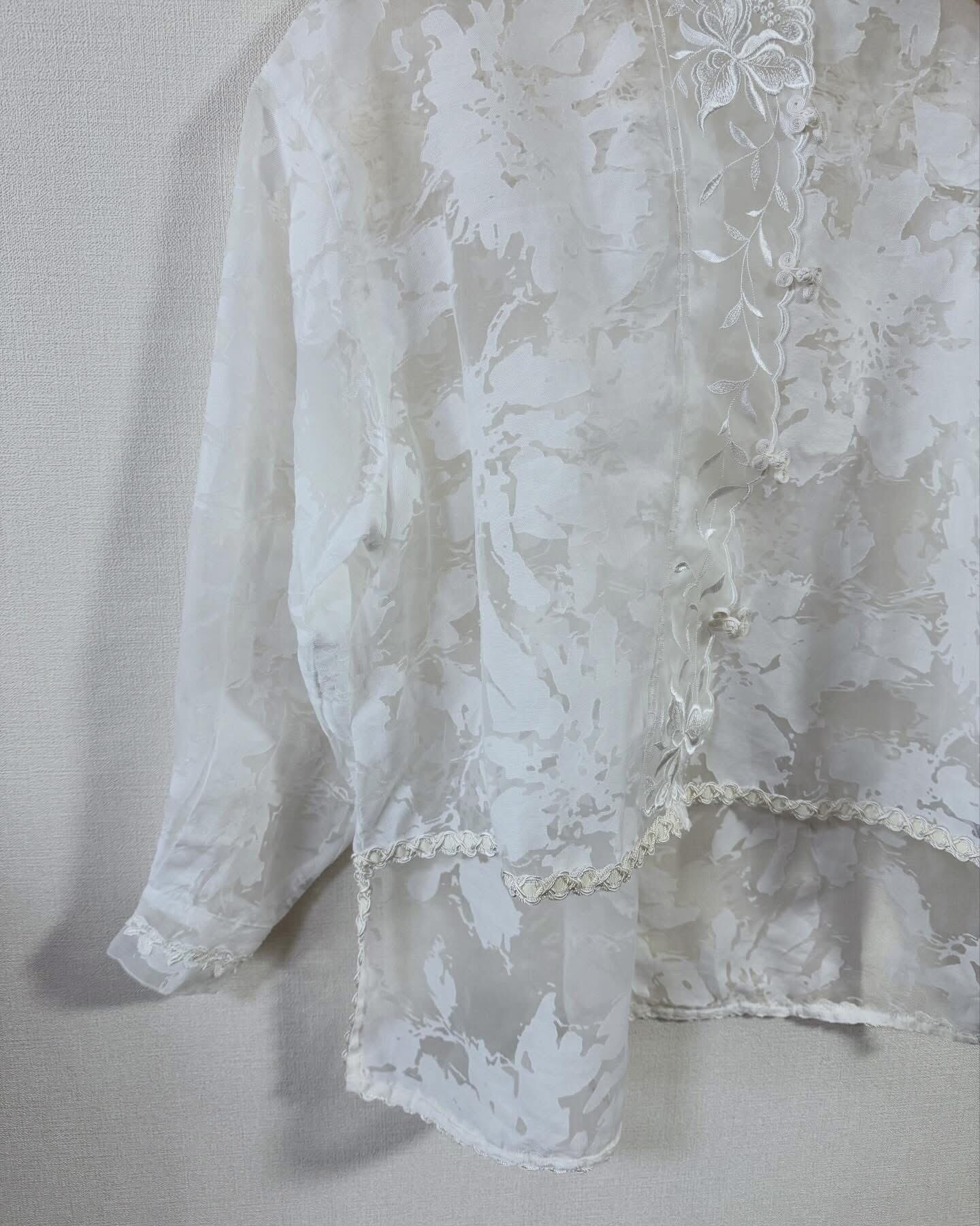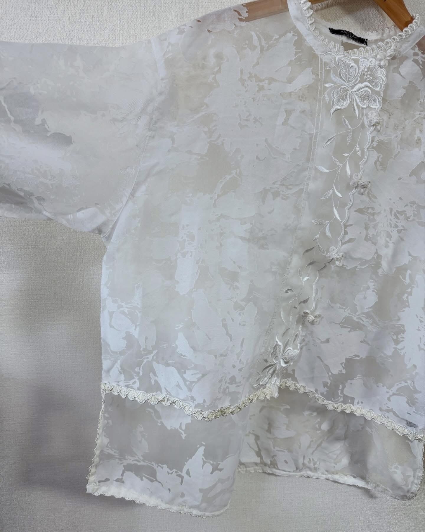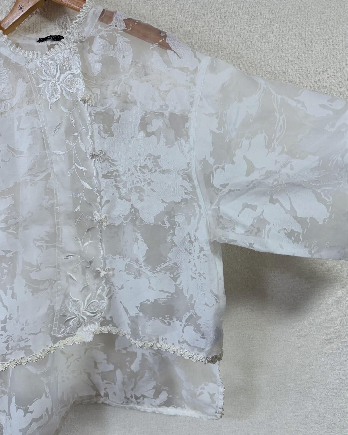 前立てに美しい刺繍モチーフとチャイナボタンを縫い付けて、上品で素敵なトップスに生まれ変わりました。