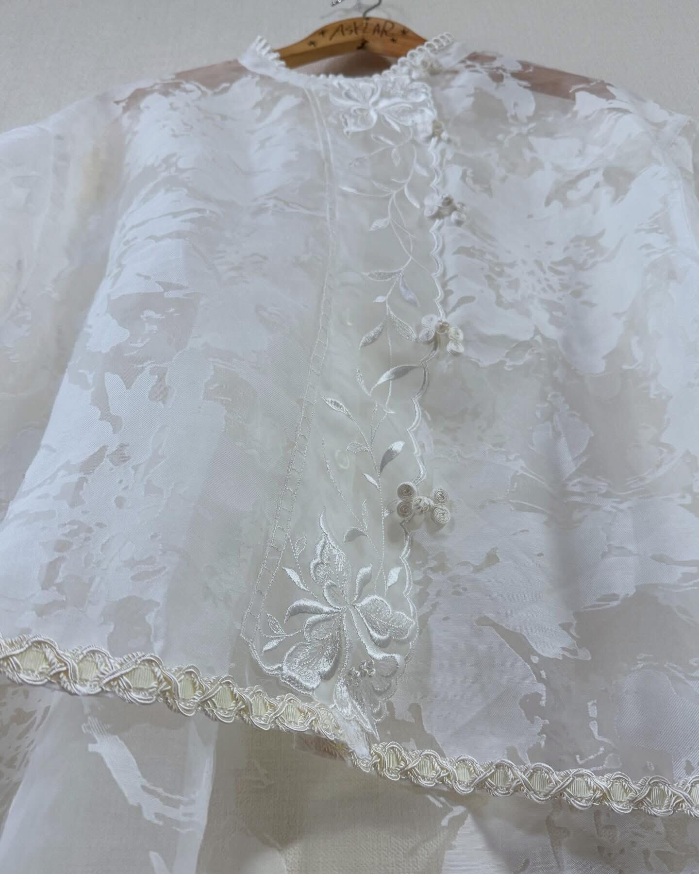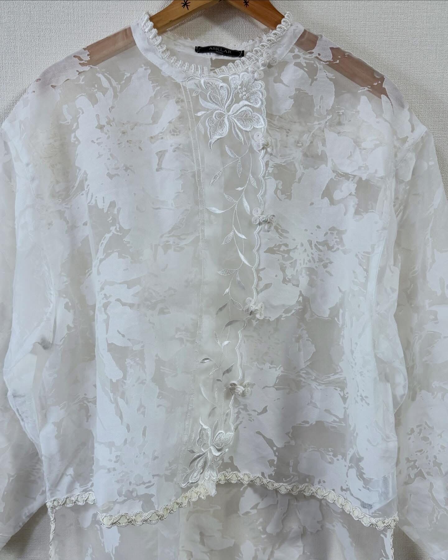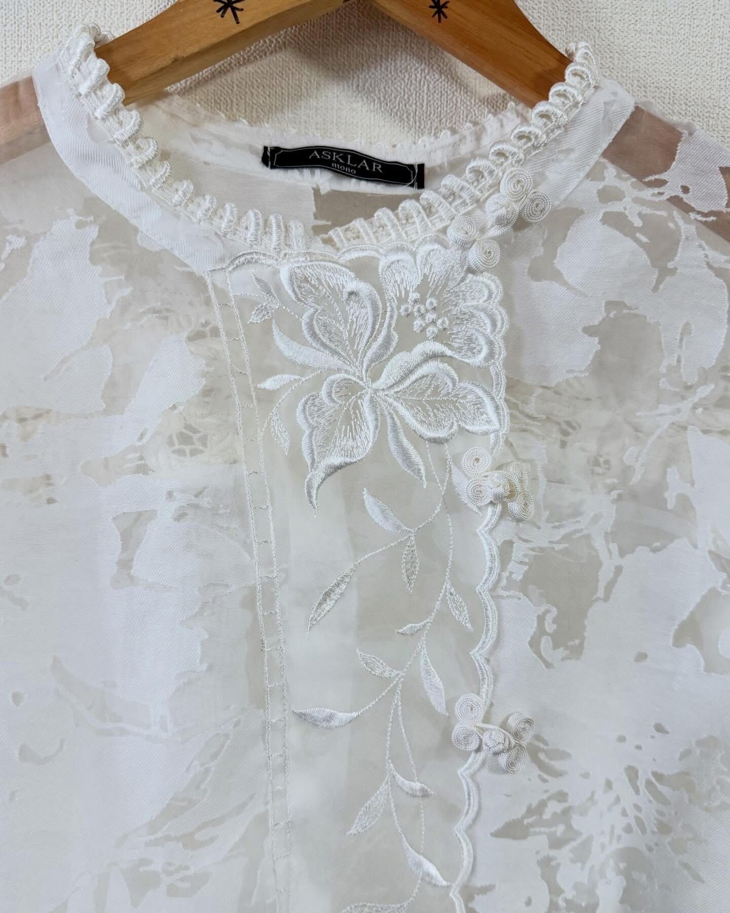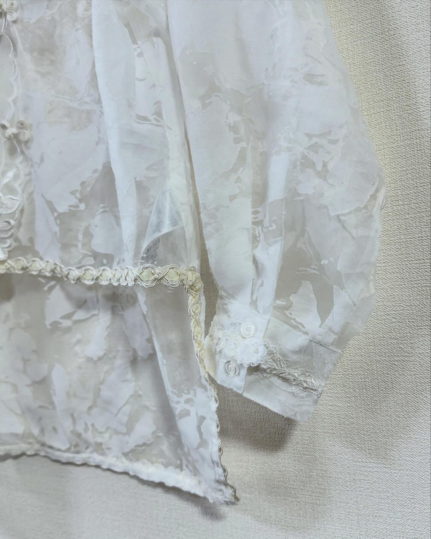 前立てに美しい刺繍モチーフとチャイナボタンを縫い付けて、上品で素敵なトップスに生まれ変わりました。