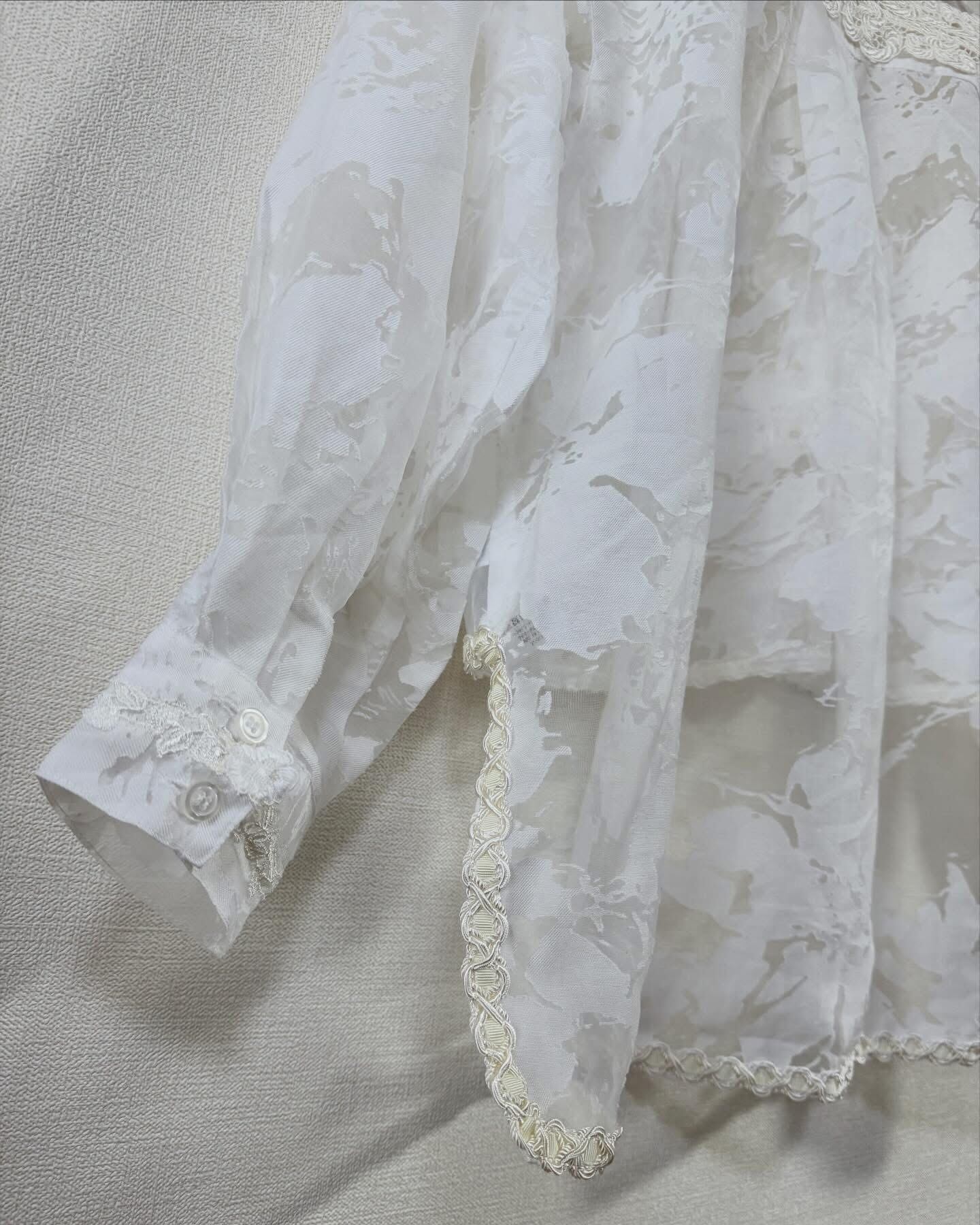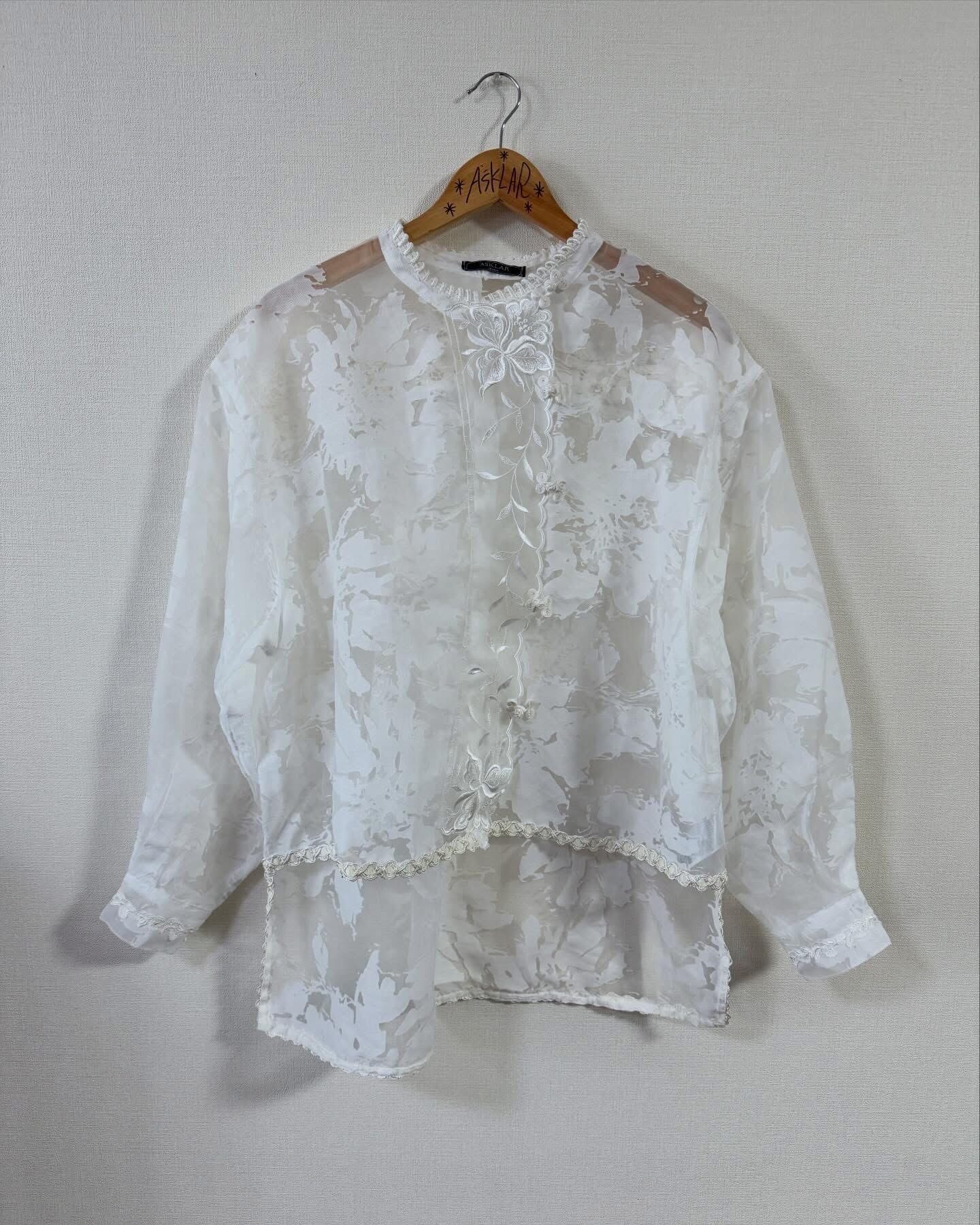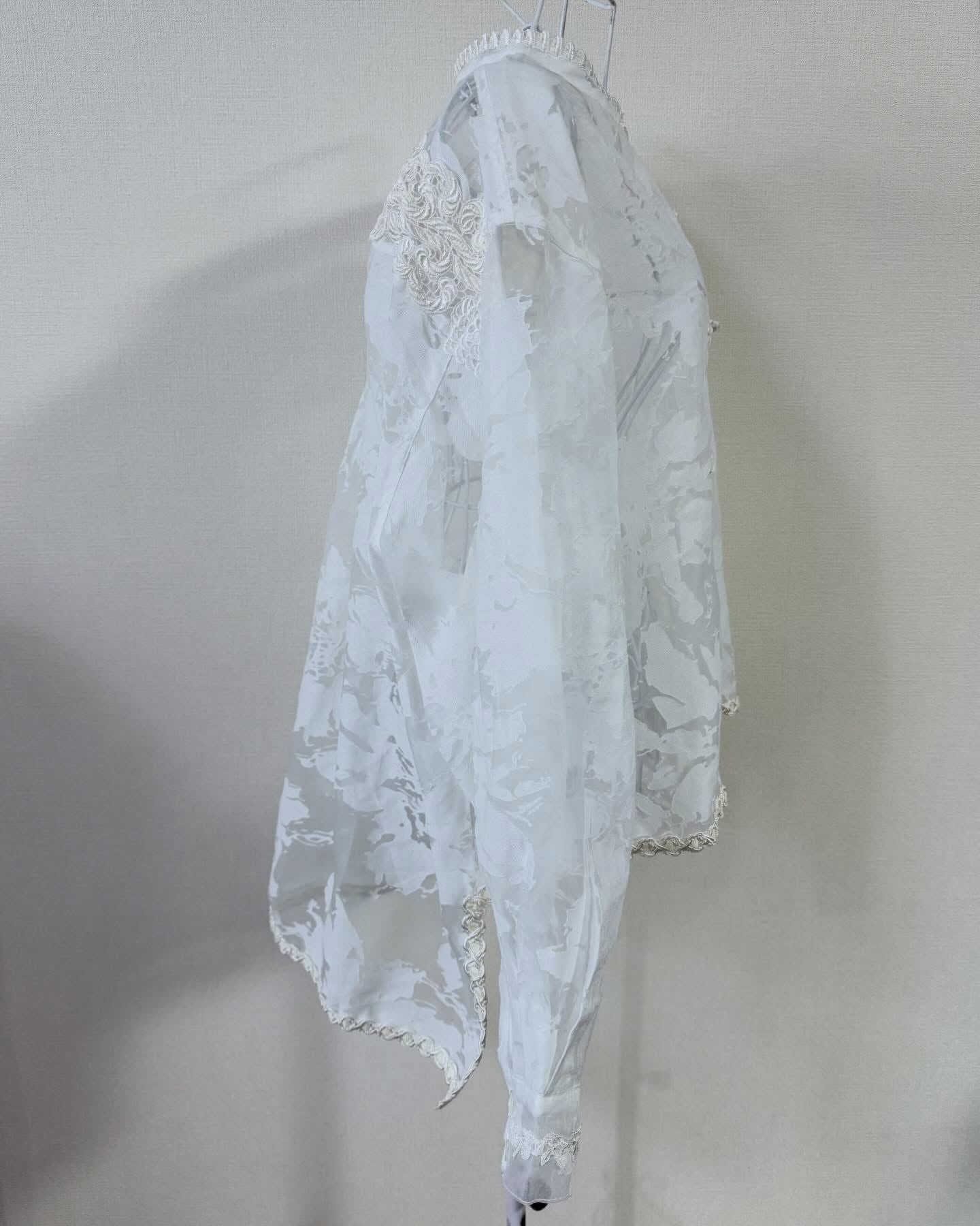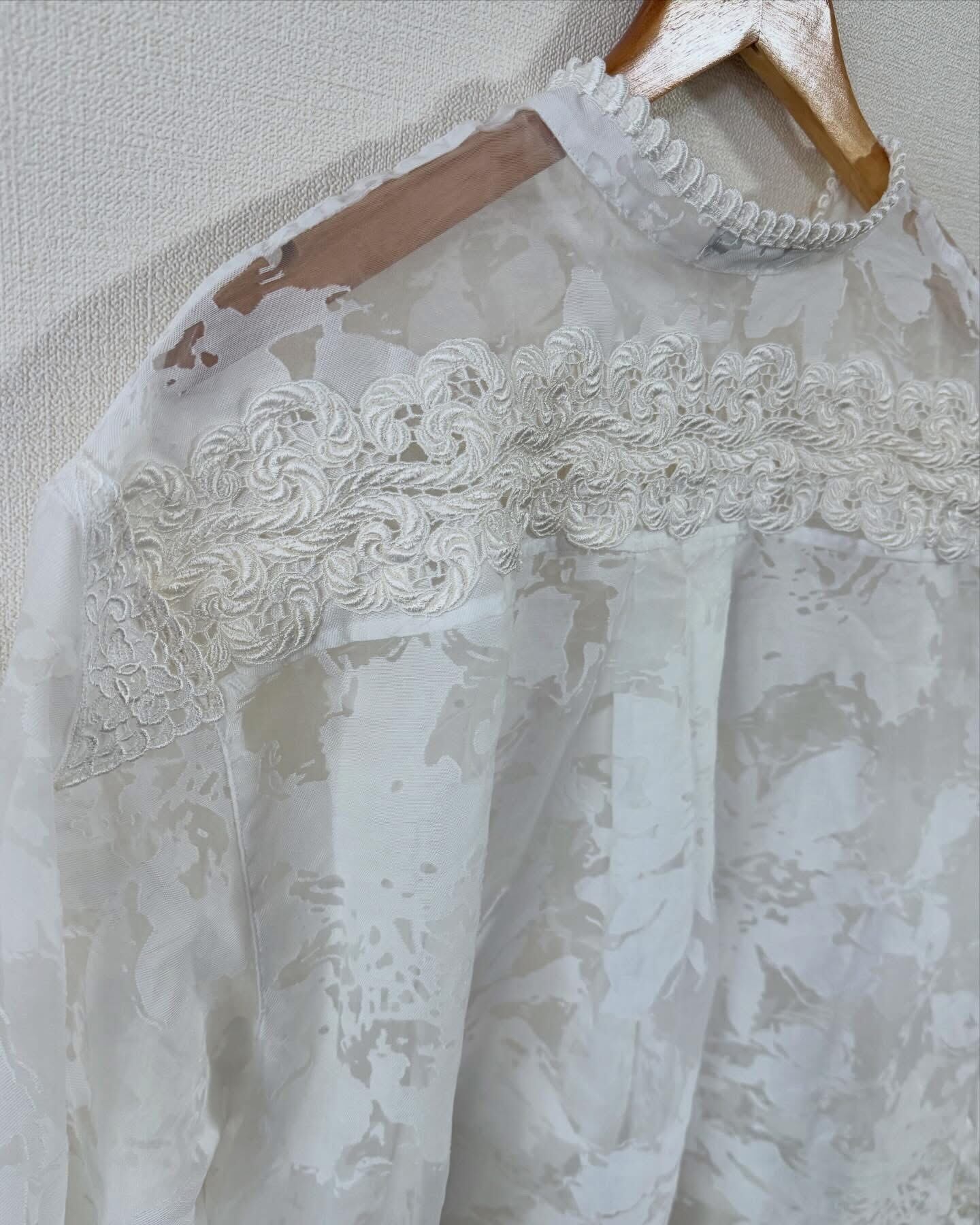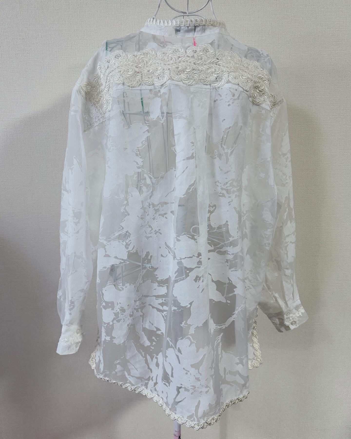 透け感があるので柄のあるインナーを着て、遊びのきかせたコーディネートも楽しみたいトップスです。