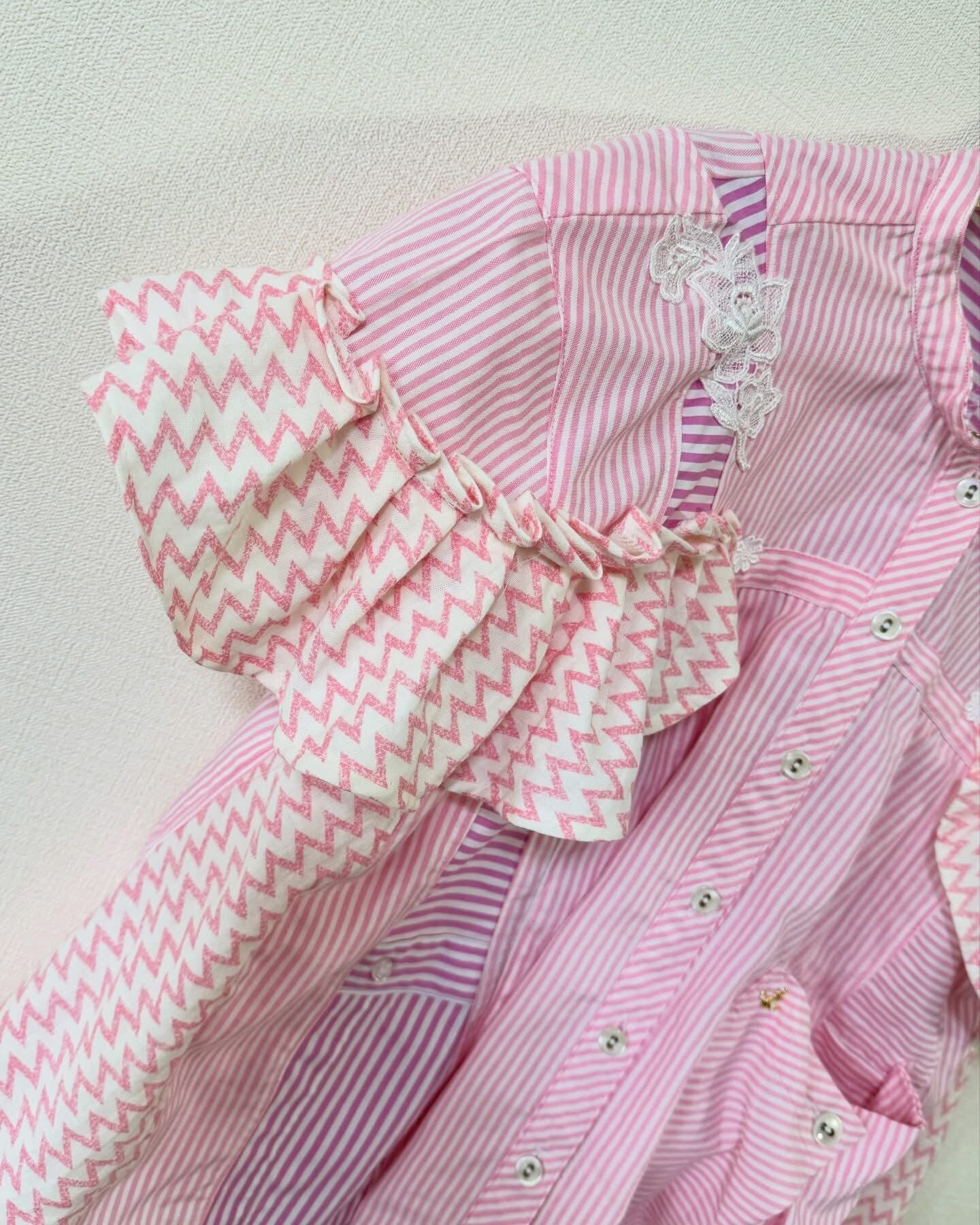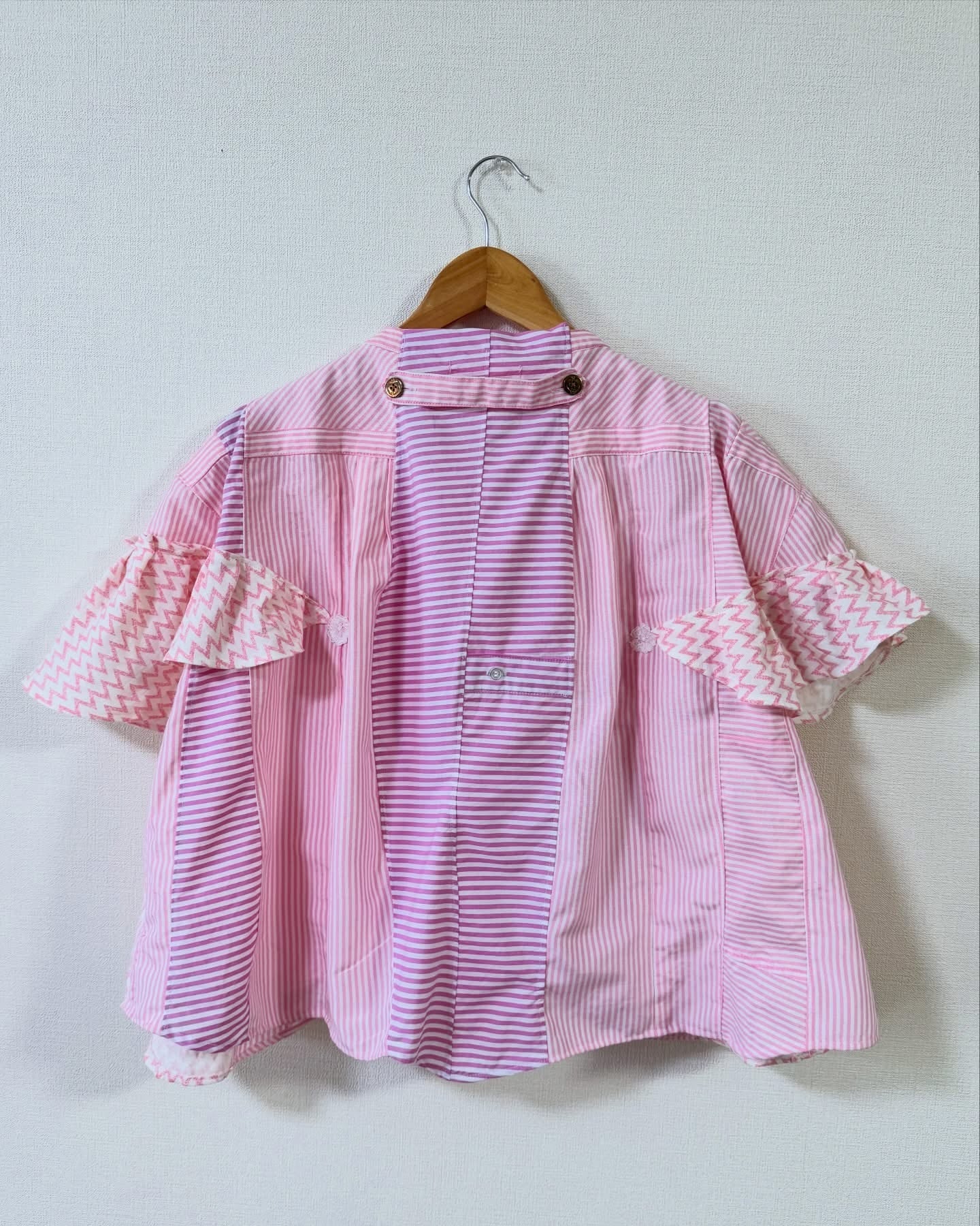 ピンク系のストライプシャツをドッキングさせてリメイクした大人かわいいシャツ☺️