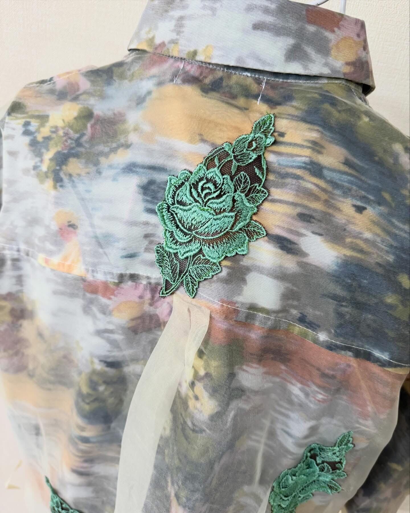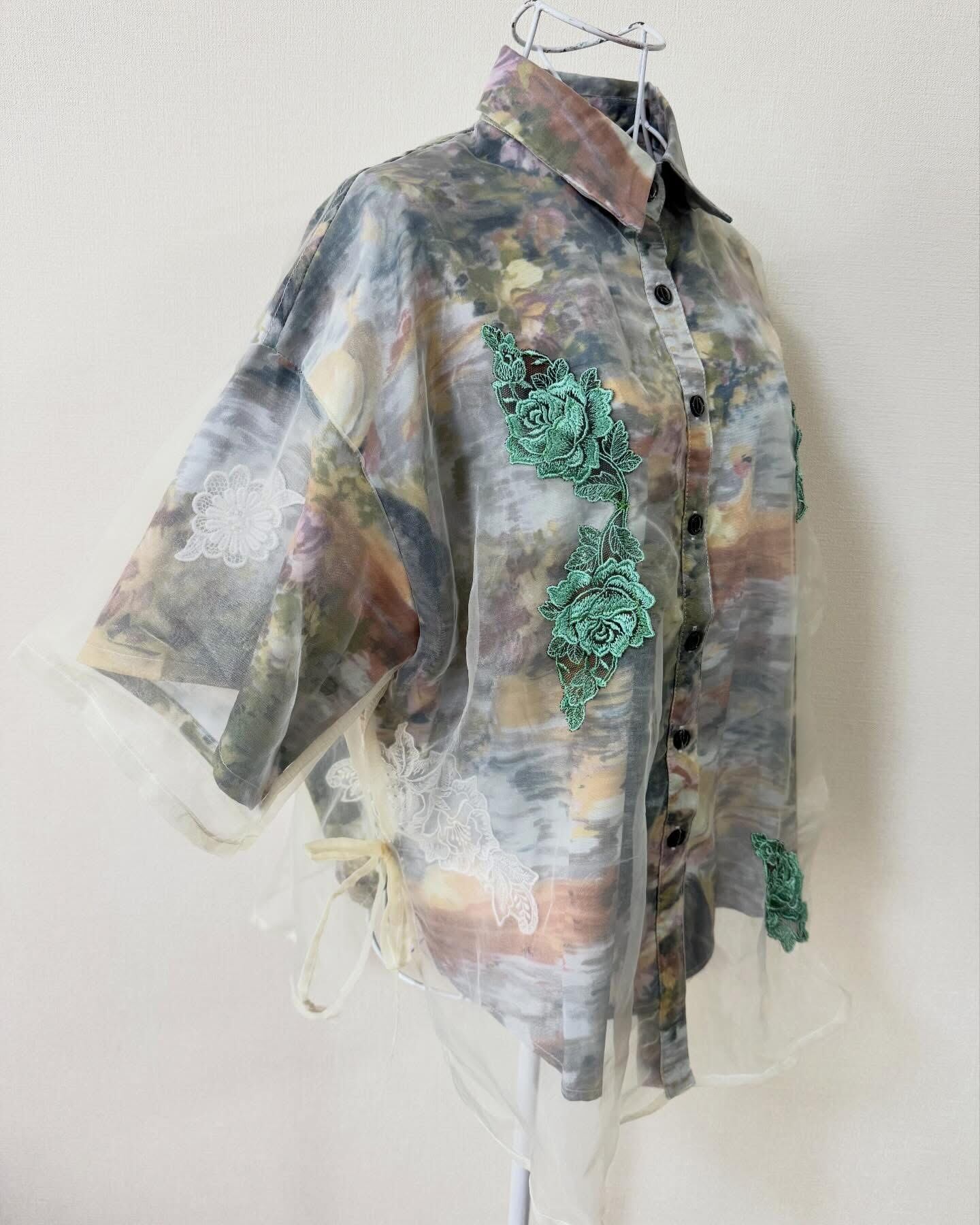 透け感のあるシャツの中と外にレースを散りばめて、軽やかで奥行きのある一着に仕上げました☺️