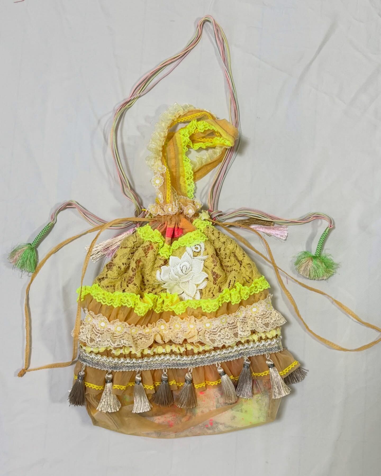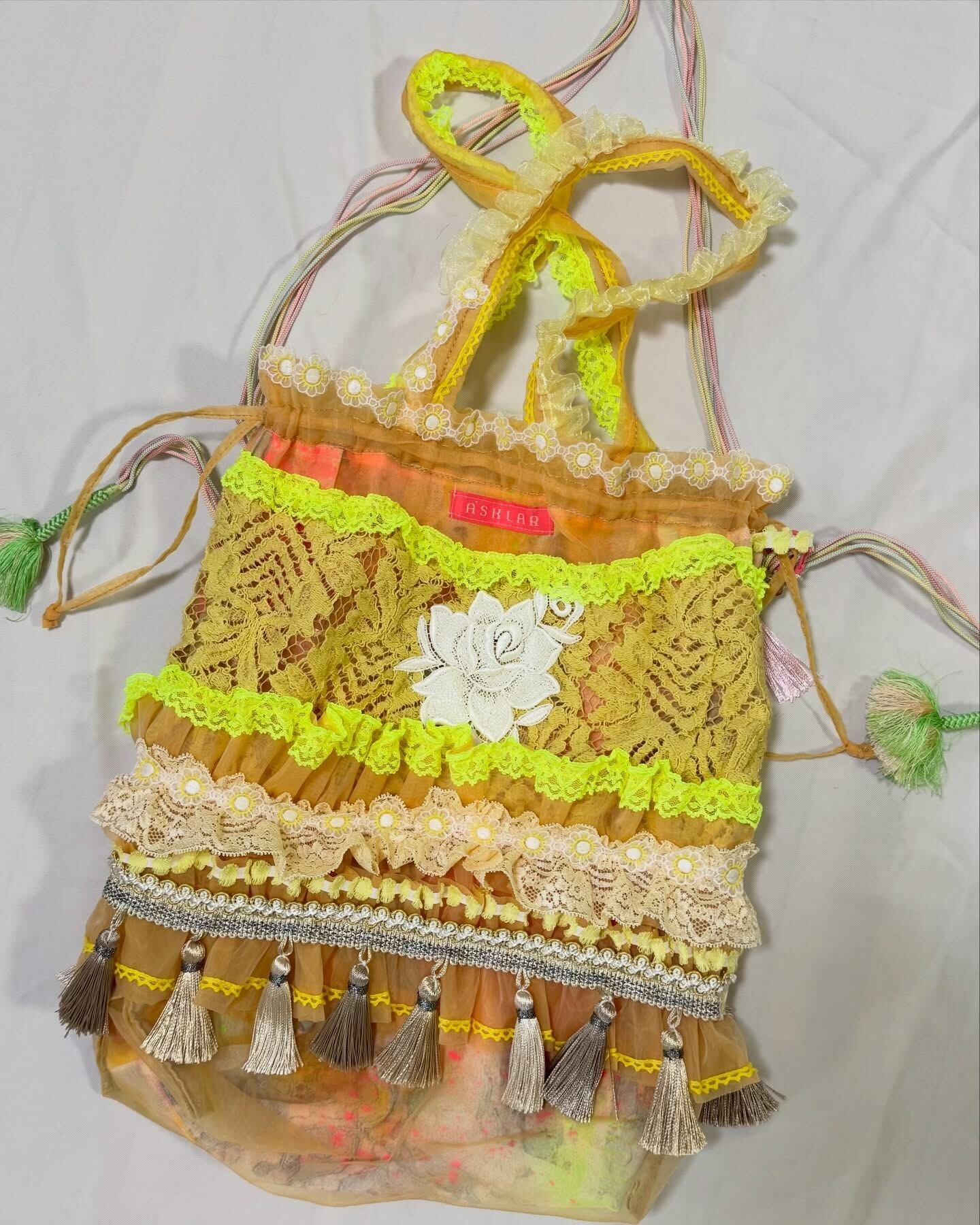 無地だった巾着バッグにさまざまなフリルやフリンジをたっぷり縫い足してリメイクした1点ものバッグ。